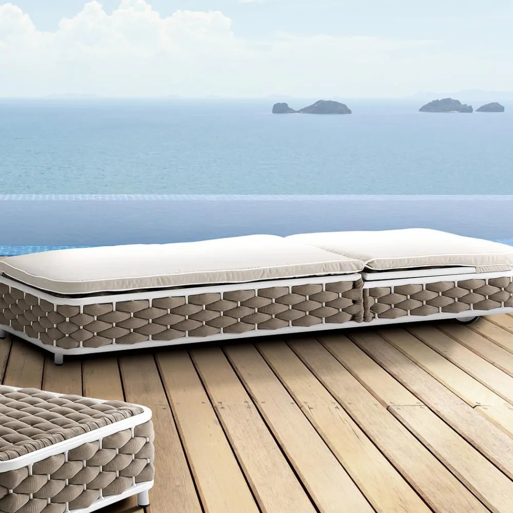 . Diese Gartenliege zeichnet sich durch ihre sichtbare Struktur aus Aluminium weiß lackiert und ihren handgewebten Olefin-Schlauchstoff, ein spezielles Material für den Außenbereich, gepolstert mit Polyurethan. Das optionale Kissen ist aus steingrauem Outdoor-Gewebe.