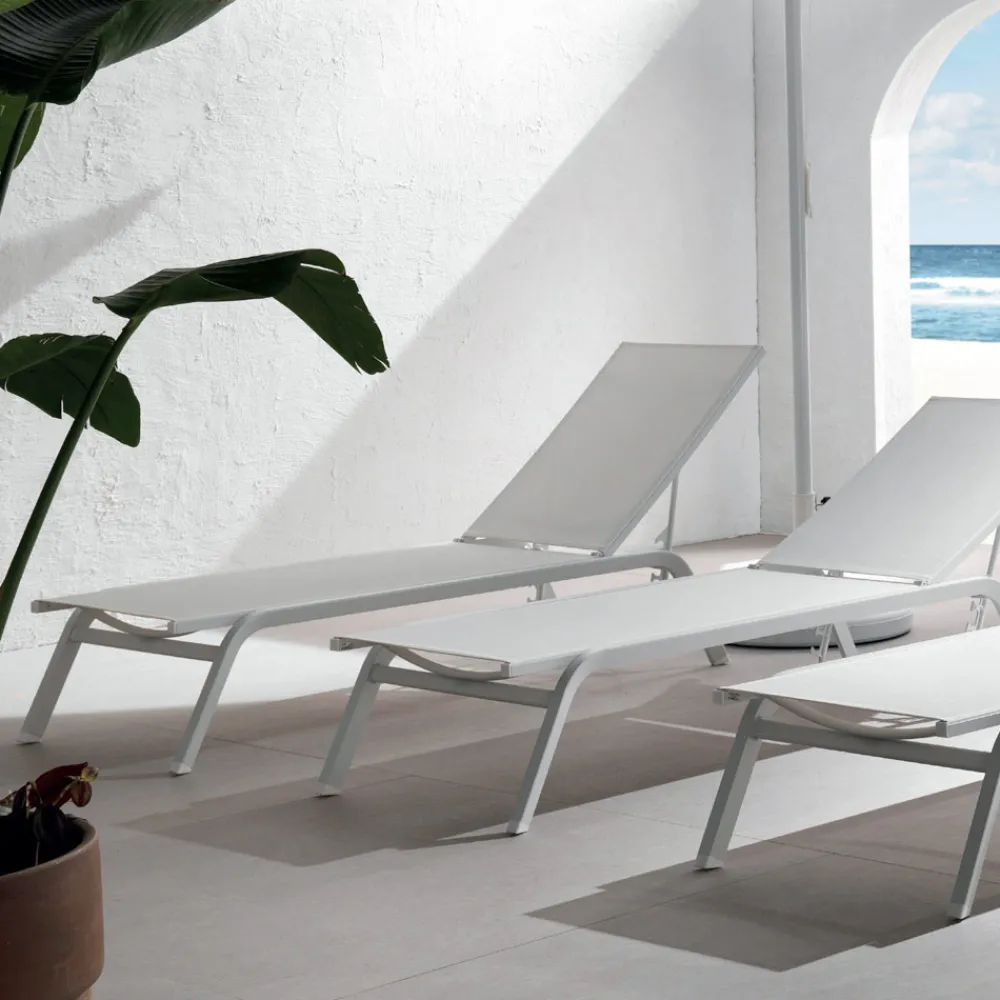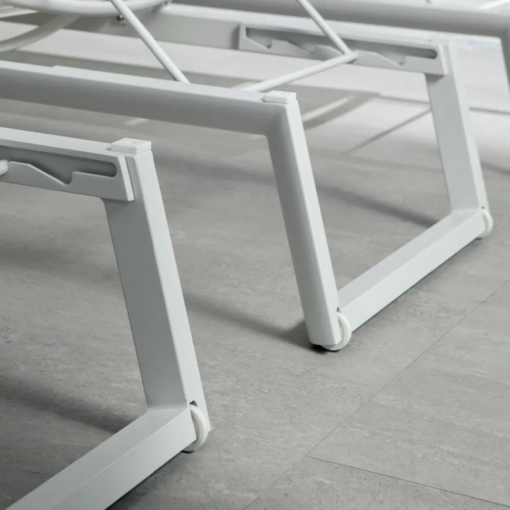 Outdoor-Sonnenliege mit epoxidpulverbeschichteter Aluminiumstruktur kombiniert mit dem Textilene-Netz mit neigbarer Rückenlehne bis zu 4 Positionen mit einziehbaren Rädern, hervorragend für die Gewährleistung einer großen Mobilität für dieses Produkt.