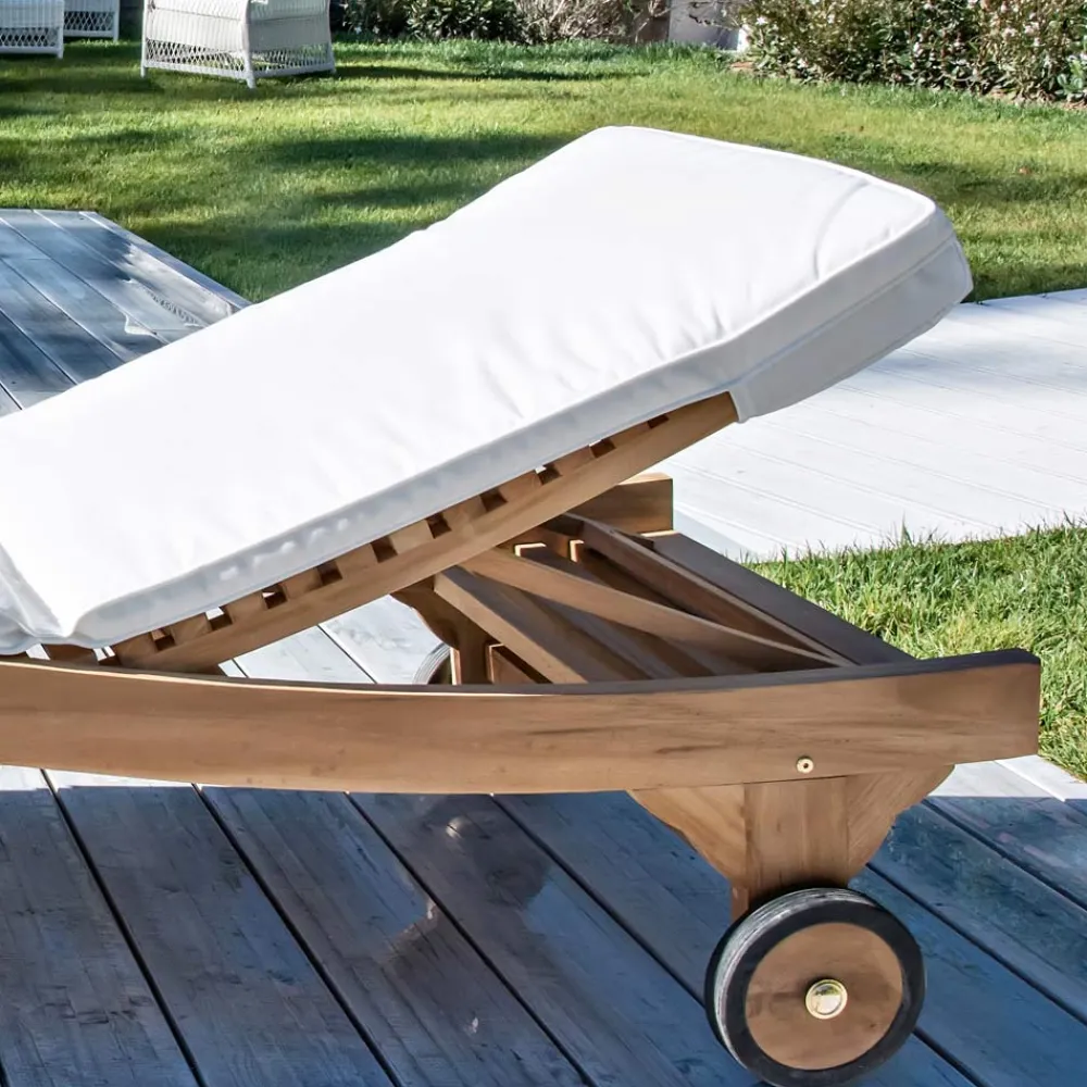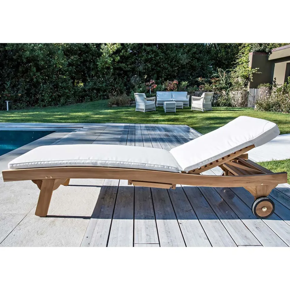 Outdoor Liege aus natürlichem Teak Holz. Sie ist mit diskreten und bequemen Rädern ausgestattet, die die Bewegung erleichtern. Es hat eine verstellbare Rückenlehne in verschiedenen Positionen, um die Neigung an die verschiedenen Komfortbedürfnisse anzupassen; außerdem hat es ein abnehmbares Tablett, perfekt, um Ihren Cocktail ohne Sorgen abzustellen.