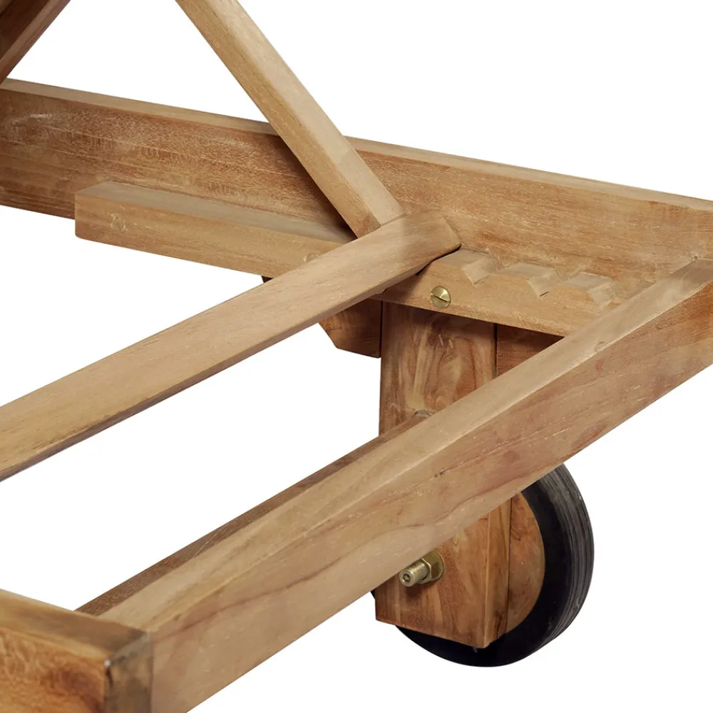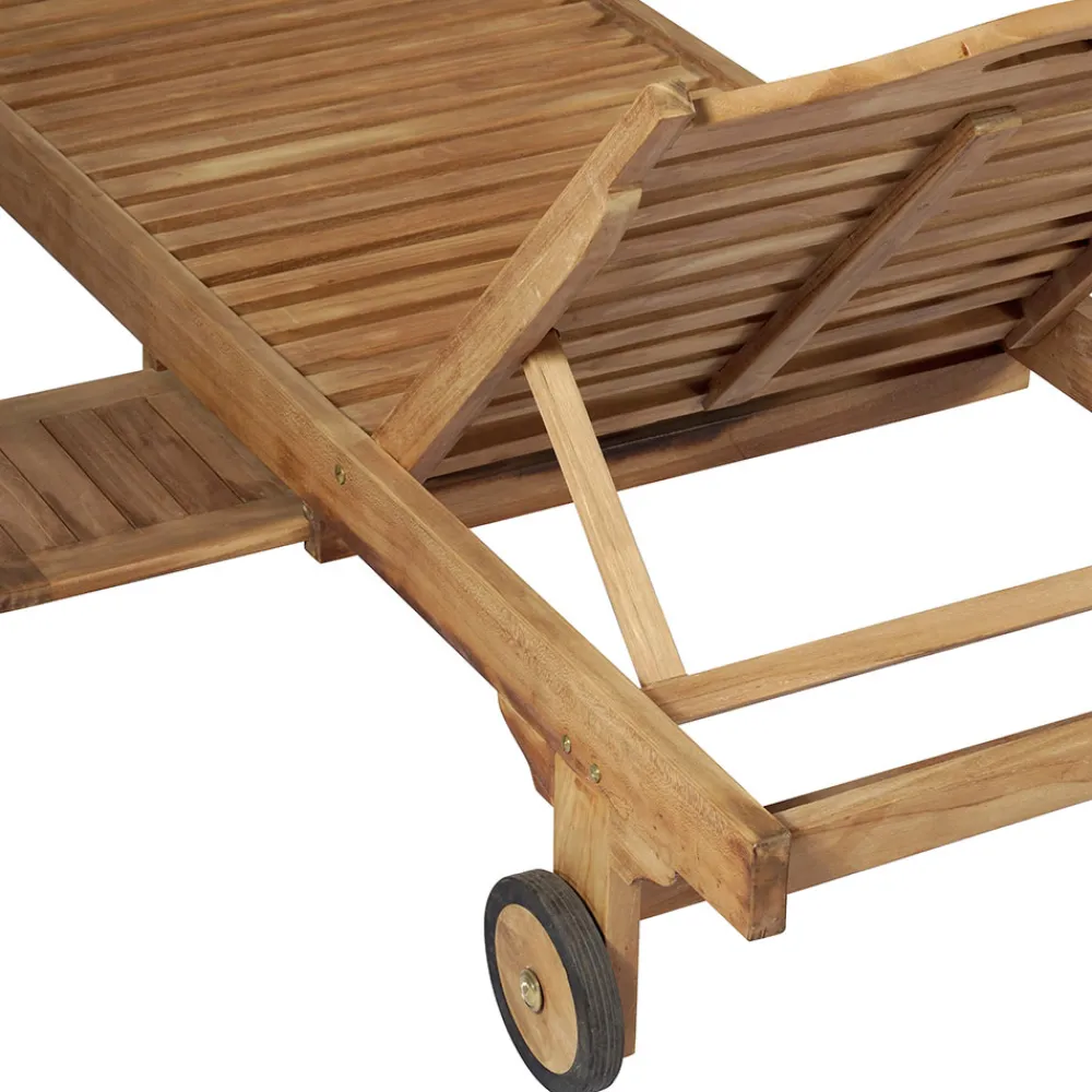 Sonnenliege für den Außenbereich komplett aus Teakholz mit Rädern und abnehmbarem Tisch .