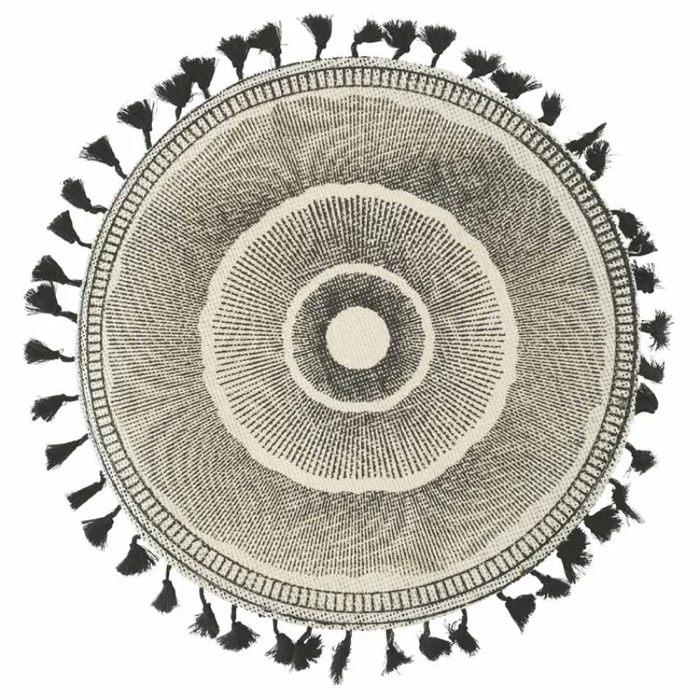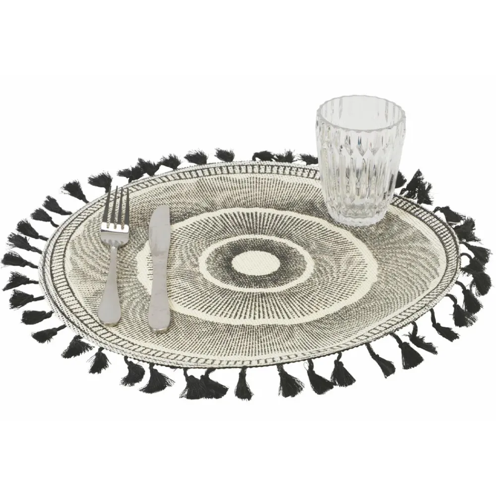 Rundes Tischset aus weißer Jute mit schwarzen Fransen, 12-teilig.
