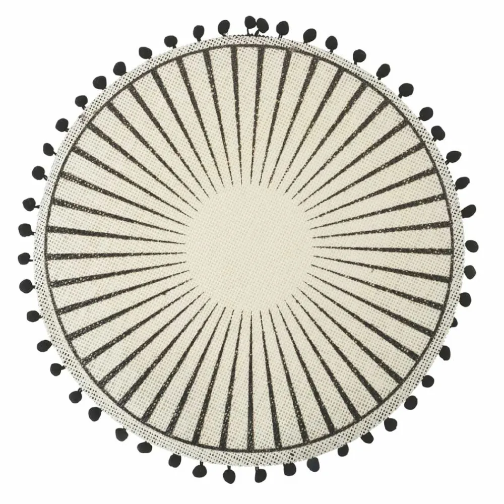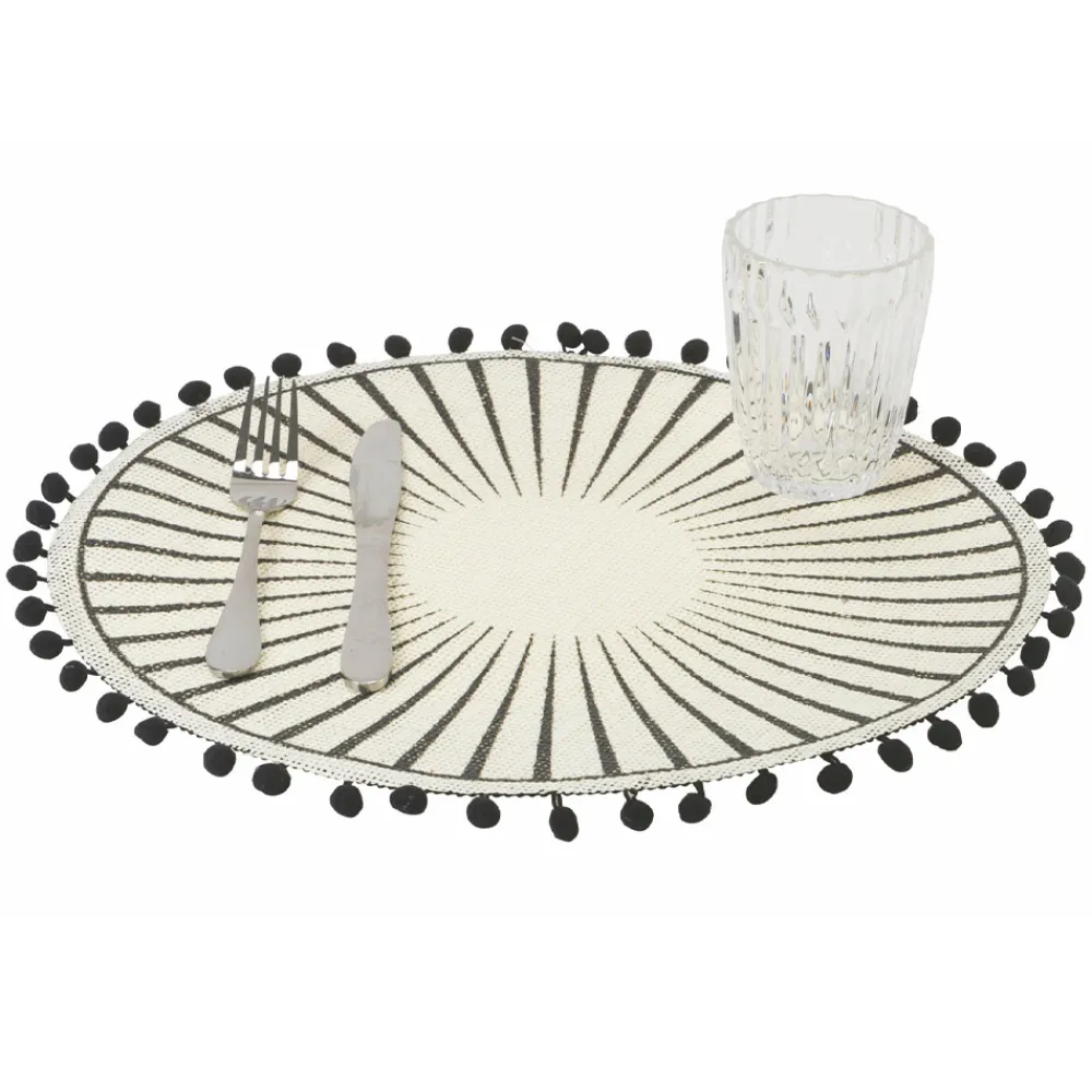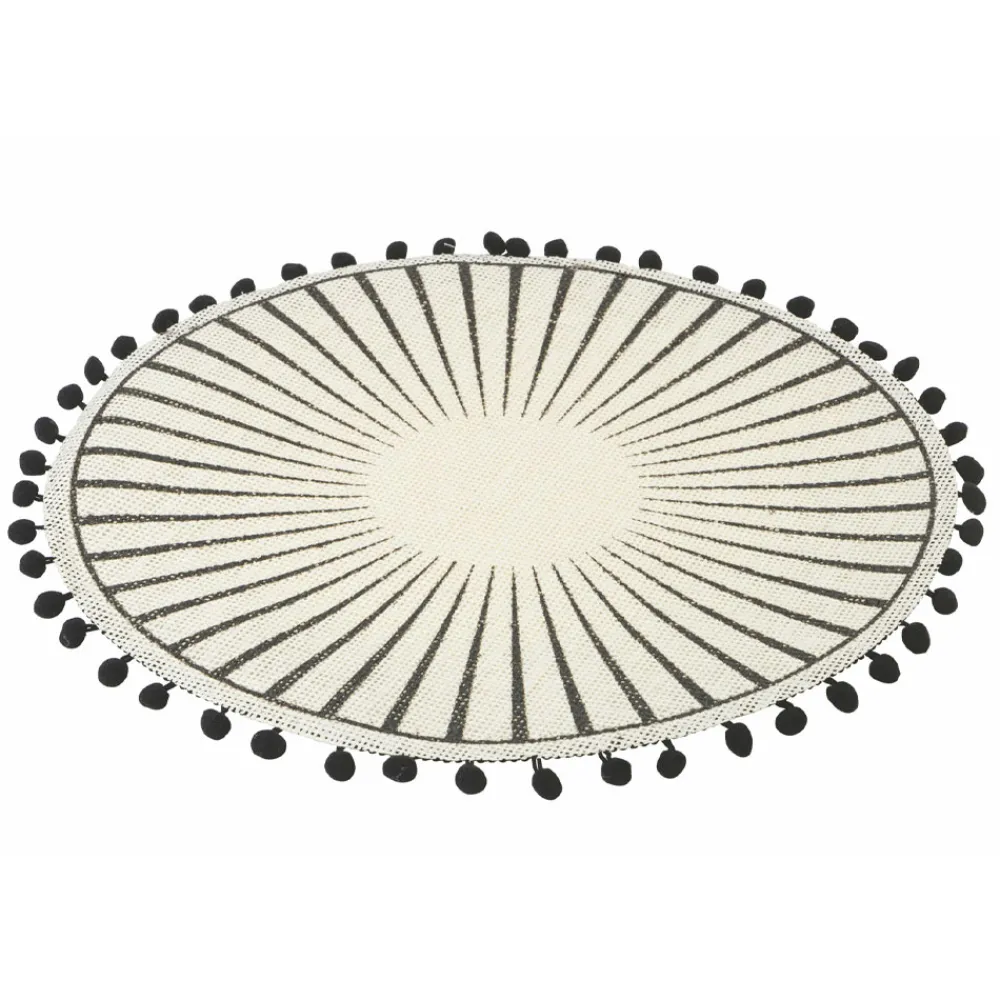 Rundes Tischset aus weißer Jute verziert mit schwarzen Pompons, 12-teilig.