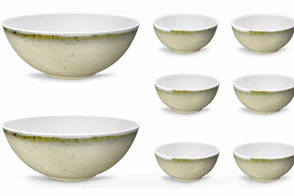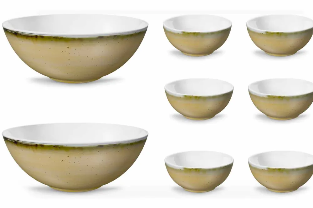 Das Design dieses Teller-Sets wird als einfach, elegant und raffiniert präsentiert, hergestellt aus Calcomania in verschiedenen Farben, für einen rustikalen und vielseitigen Stil.