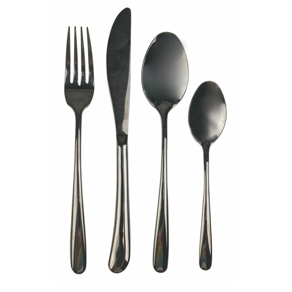 Glänzendes schwarzes Stahlbesteck im 24-teiligen Tropfendesign.