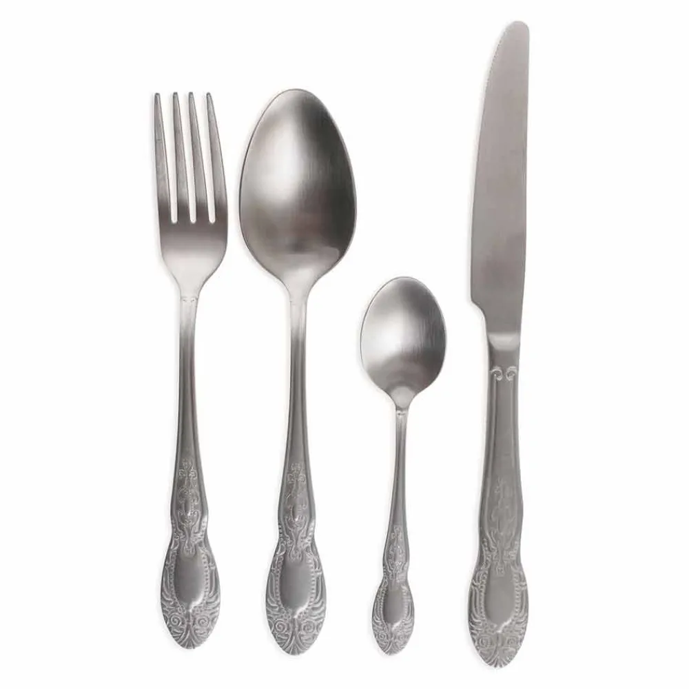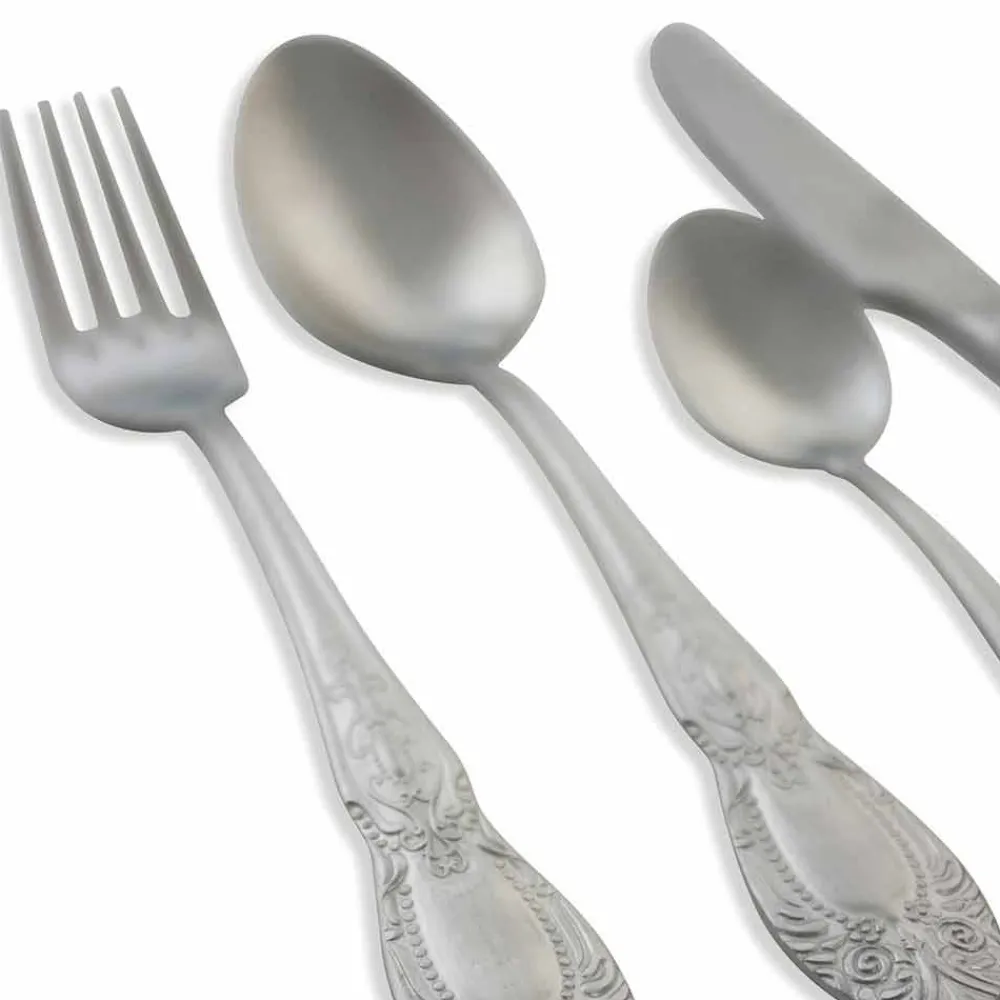 Ein romantischer Service aus Satinstahl mit prächtigen Barockdekorationen am Griff für einen raffinierten Effekt im Shabby-Chic- Stil .