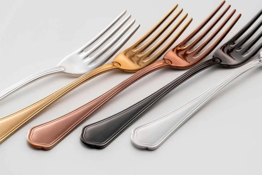 PVD ist die Abkürzung für Physical Vapour Deposition, eine Technologie zum Färben von Stahl in speziellen Vakuumkammern, in denen sehr dünne Metallfilme mit Dampf besprüht werden, die auf dem Besteck kondensieren. Diese Behandlung mit einer Reihe wundervoller Farbtöne verschönert das Besteck nicht nur, sondern macht es auch widerstandsfähiger gegen Verschleiß und Kratzer und ist eine perfekt nachhaltige Beschichtung, die für die Verwendung in Lebensmitteln geeignet ist.