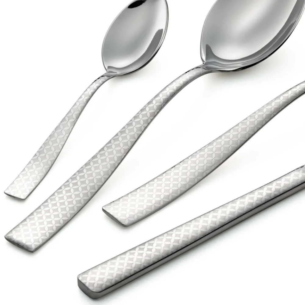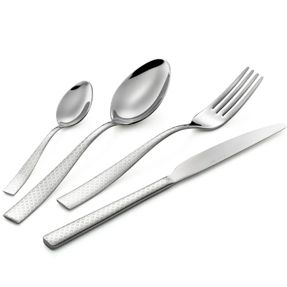 Minimalistisches Edelstahl-Besteckset mit geometrischer Laser-Dekoration, 24-teilig made in Italy.