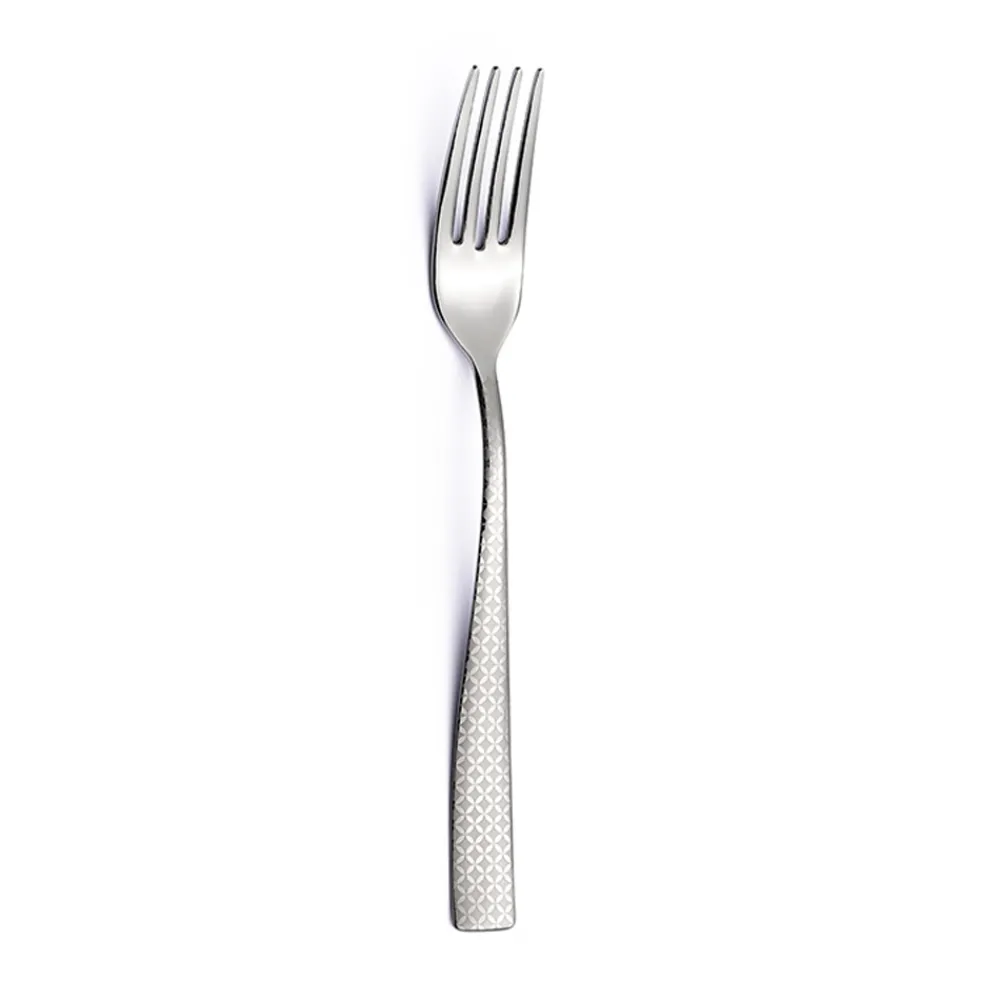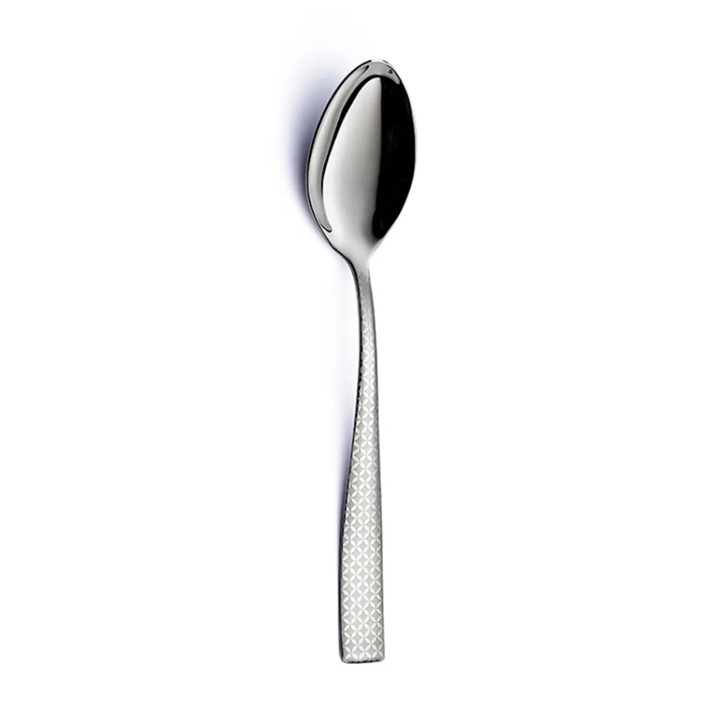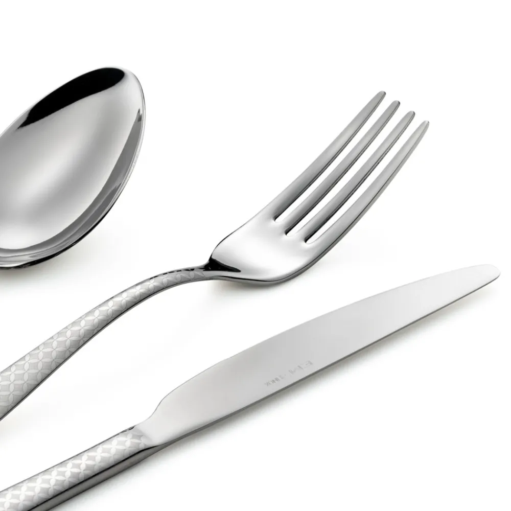 Die Kollektion zeichnet sich durch das anspruchsvolle geometrische Design mit Hightech- Laser aus. Das minimalistische Design der breiten Griffe, die geformte und längliche Form der Löffelschale und die Nüchternheit der Gabel evozieren eine Vorstellung von Reinheit und Unendlichkeit.