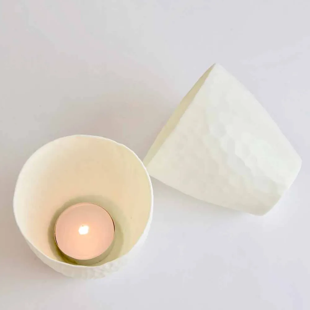 Porzellan ist ein äußerst widerstandsfähiges Material, das bei einer höheren Temperatur als herkömmliche Keramik gebrannt wird. Daher ist es dank seiner höheren Dichte, Härte und Gleichmäßigkeit robuster und haltbarer, schmutzabweisend und wasserdicht. Seine Eigenschaften werden durch das Doppelbrennen bis zu 1240 ° garantiert, woraufhin das sehr durchscheinende Porzellan eine kostbare warmweiße Farbe annimmt, die sich weiter erwärmt, sobald die Kerze im Inneren angezündet wird.