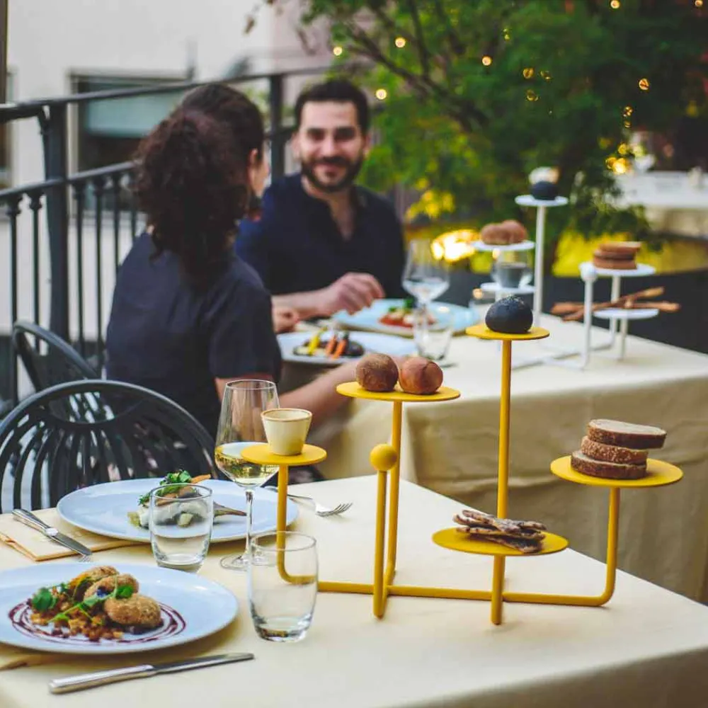 Dieser Backsplash wird vollständig in Italien aus RAL-lackiertem Stahl hergestellt , was dem Produkt ein modernes und raffiniertes Design verleiht. Seine Struktur besteht aus 5 praktischen runden Oberteilen in verschiedenen Höhen, die sich ideal für kleines Gebäck oder Fingerfood eignen. Aufgrund seiner Form und geringen Größe ist dieses Produkt ideal als echtes Designelement auf dem Tisch, das dazu beiträgt, dass jede kulinarische Kreation zu einem echten Kunstwerk wird.