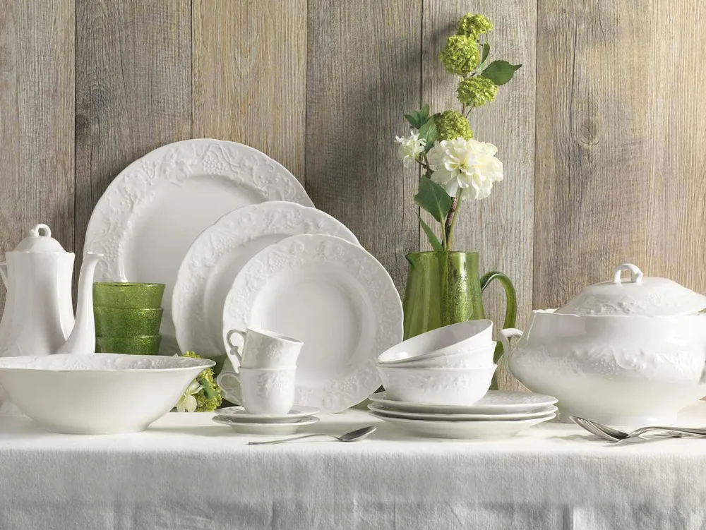 Natürlicher Charme und skulpturale Eleganz im Relief sind die Schlüsselwörter dieser Kreationen aus hellweißem Porzellan und einer künstlerischen Reliefdekoration. Einerseits ein attraktives Design mit mehreren Formen, andererseits die charmante ländlich inspirierte Dekoration.