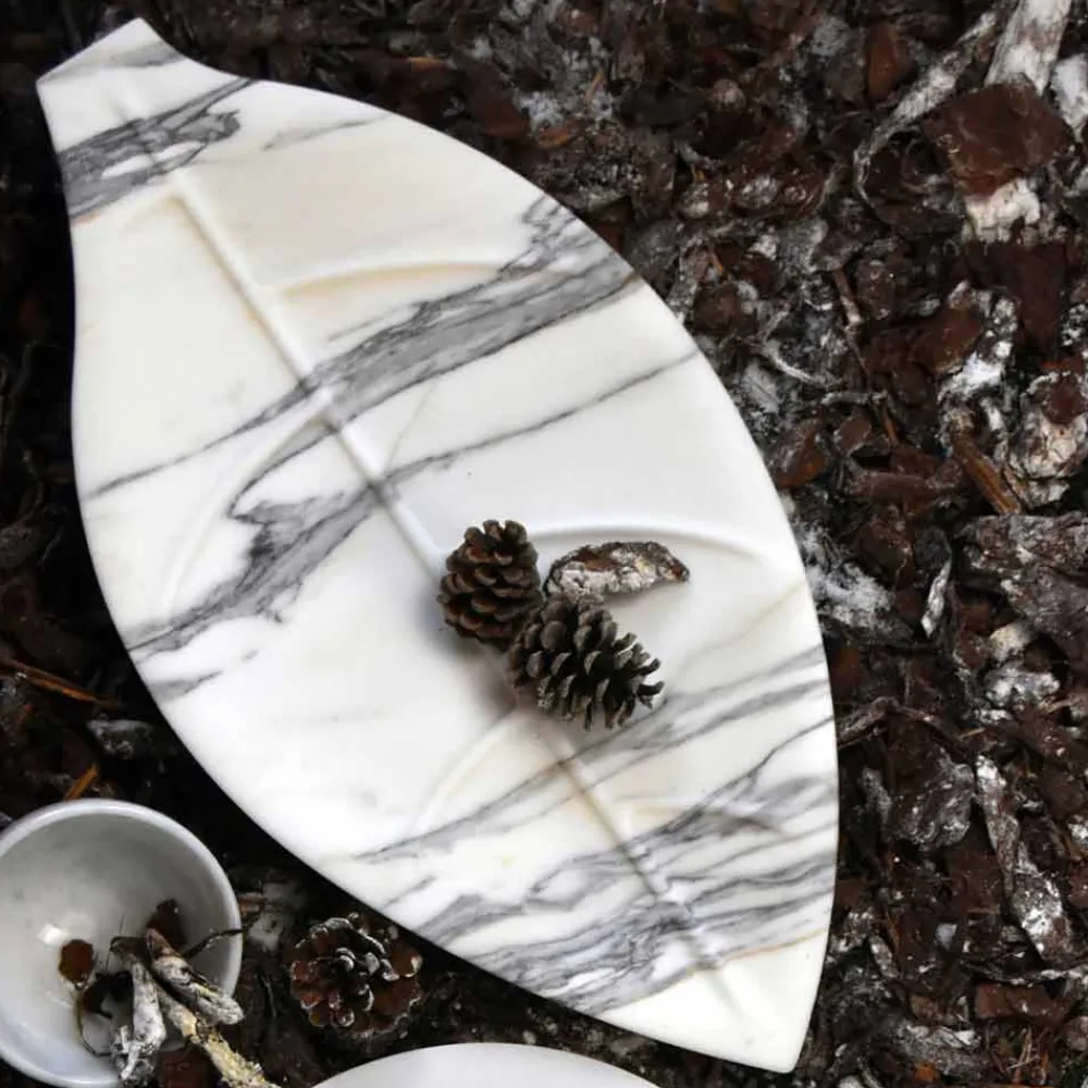 Herzstück, gekennzeichnet durch ein raffiniertes Design und seine Blattform mit geschwungenen und einfachen Linien, aber mit einer starken visuellen Wirkung. In Italien handgefertigt aus Arabescato-Marmor , einem Material, das dem Produkt seinen wunderbaren, raffinierten und eleganten Stil verleiht und sich ideal für die Dekoration der unterschiedlichsten Räume des Hauses eignet . Die Kombination von Materialien, Oberflächen und Techniken zusammen mit der wunderbaren Arbeit der Meister ermöglicht es, ein qualitativ hochwertiges Endprodukt mit Liebe zum Detail zu erhalten, das sich perfekt für die Dekoration von Umgebungen mit einem zeitgemäßen und raffinierten Geschmack eignet.