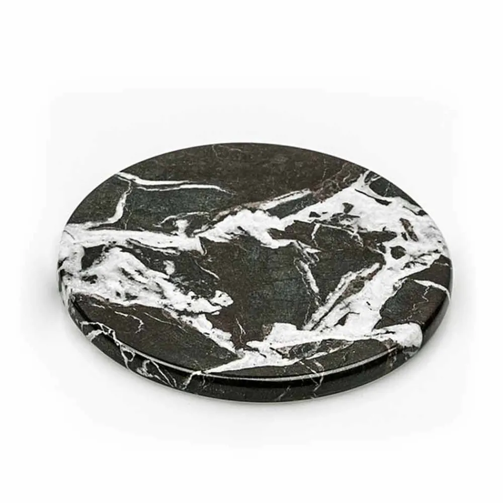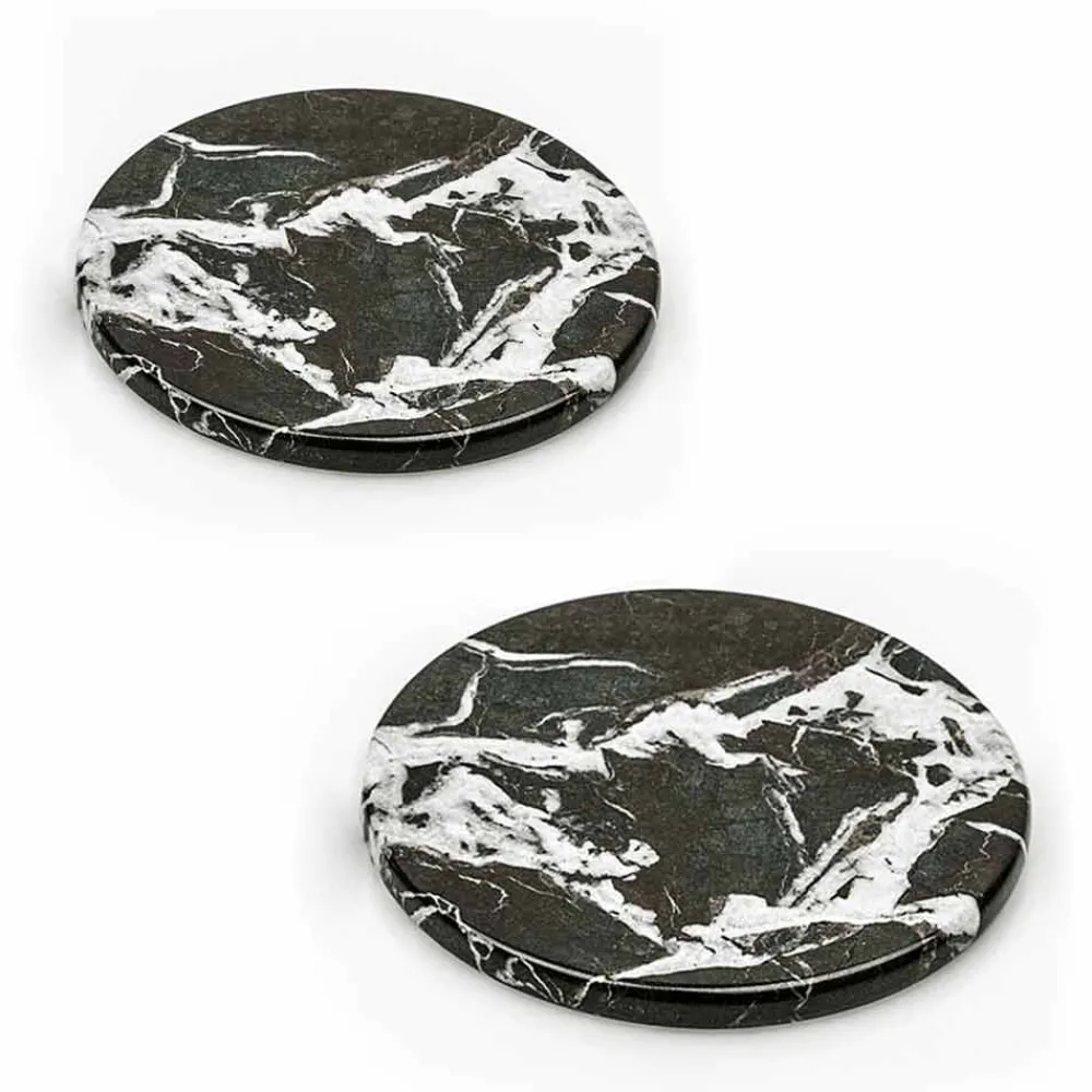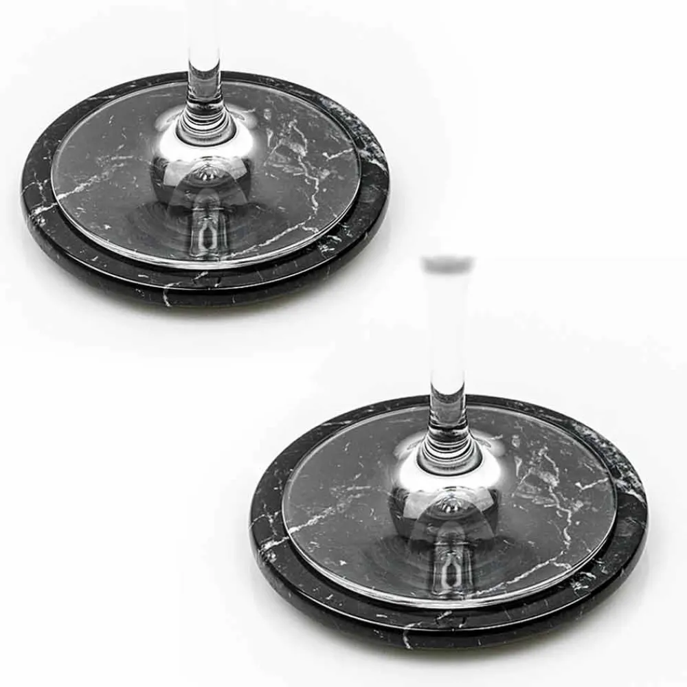 Zwei runde Untersetzer gekennzeichnet durch ein elegantes und innovatives Design und aus hochwertigem Edelmarmor. Dies sind Unikate, da sich jeder verwendete Marmorblock von den anderen für Adern und Schattierungen unterscheidet.