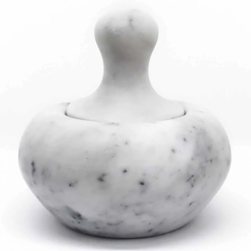 Funktioneller und eleganter Nussknacker-Stößel, der sich durch die innovative Form und den weißen Carrara-Marmor auszeichnet, aus dem er besteht.