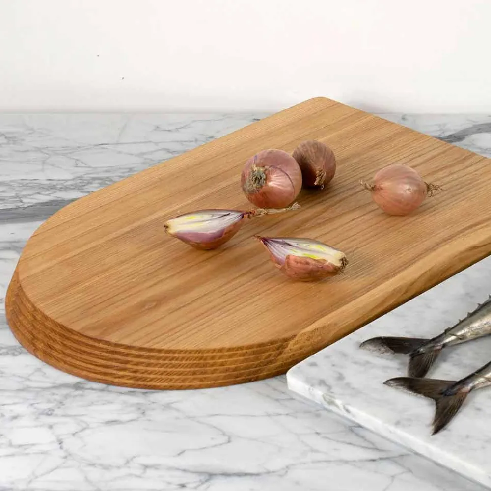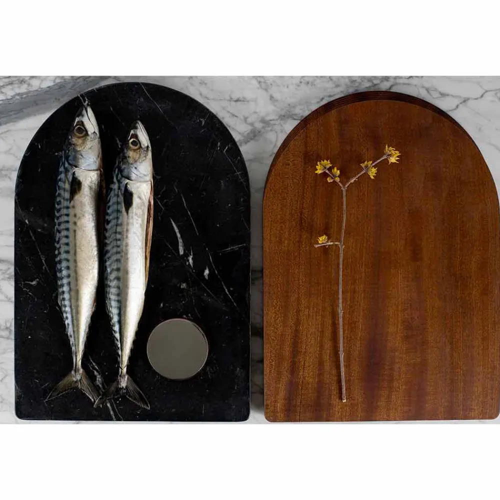 Diese Komposition funktioneller Accessoires für die Lebensmittelzubereitung, oberflächlich behandelt mit zertifizierten, für den Kontakt mit Lebensmitteln geeigneten Produkten, zeichnet sich durch die Überlappung von zwei Böden aus , eine aus Holz und eine aus Marmor, die einzeln oder gleichzeitig genutzt werden können.
