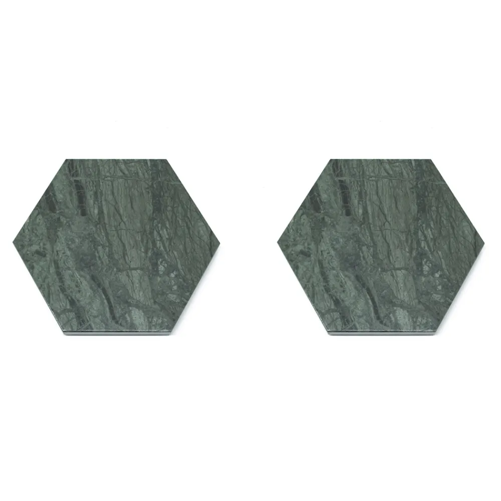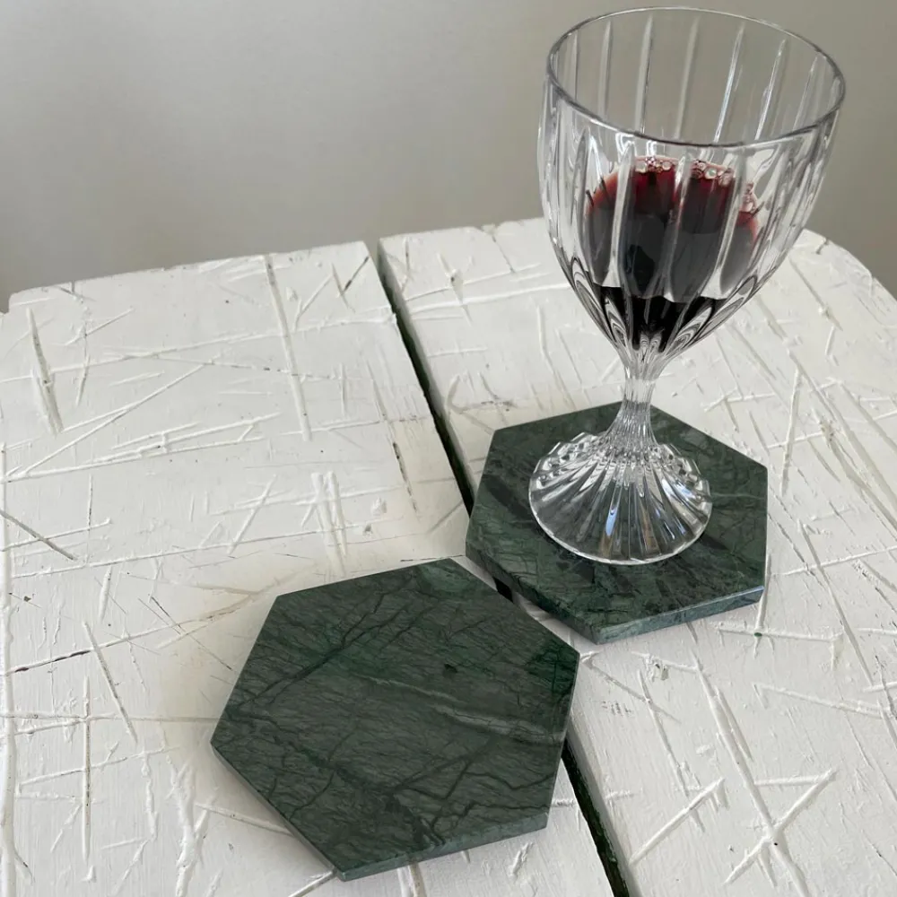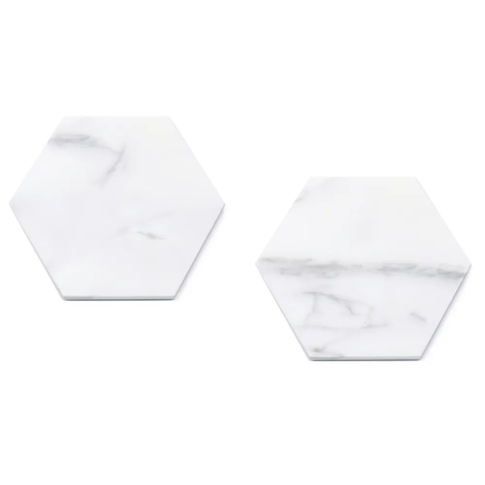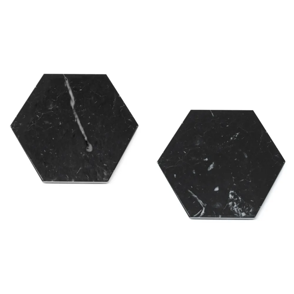Diese Marmoruntersetzer sind ein Beispiel für funktionale Eleganz für das moderne Zuhause. In eine sechseckige Form geschnitten, ein geometrischer Genuss für die Augen, und mit den natürlichen und sich ständig verändernden Adern des Marmors verziert, sind diese Untersetzer nicht nur praktisch, sondern verleihen Ihrem Tisch auch einen Hauch von Eleganz .