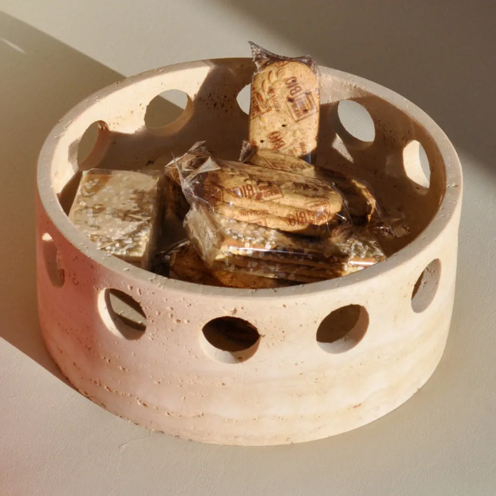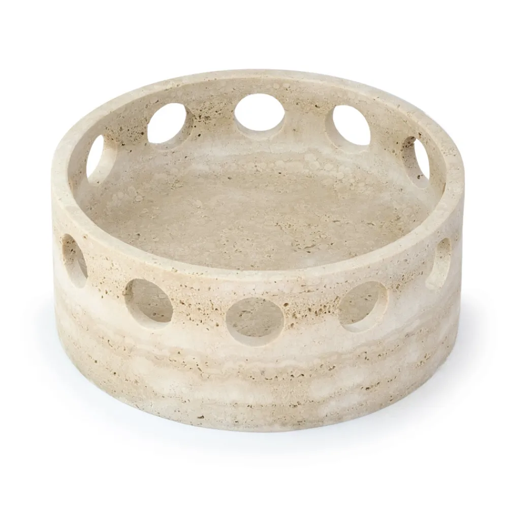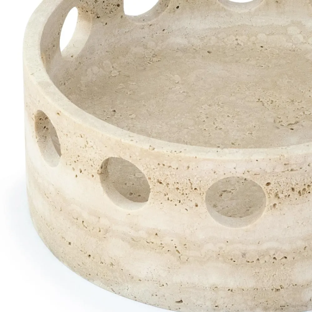Verleihen Sie Ihrem Zuhause mit diesem Marmor -Mittelstück/Tablett einen Hauch von raffinierter Eleganz . Das runde Design und die symmetrischen Perforationen machen es zu einem einzigartigen und stilvollen Stück, das sich perfekt zur Verschönerung jedes Tisches oder jeder Konsole eignet. Die Qualität von Marmor, einem langlebigen und edlen Material, zeugt von bester italienischer Handwerkskunst .