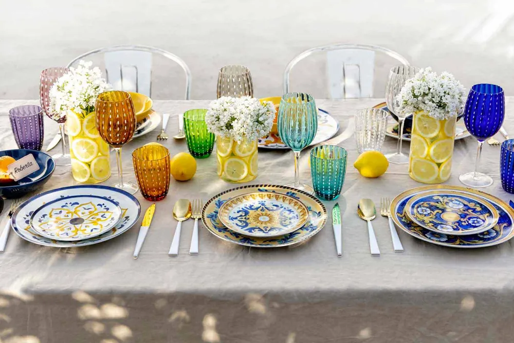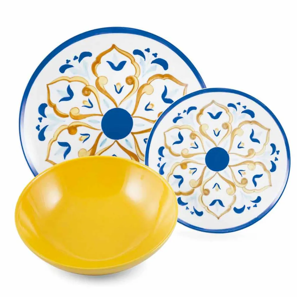 Inspiriert von seiner traditionellen Majolika bringt das Set Blau und Gelb auf den Tisch, die die Farben der Tiefsee und die Brillanz der Zitronen widerspiegeln, während die prächtigen Arabesken an die außergewöhnlichen dunkelbraunen Köpfe erinnern, Symbole der sizilianischen Kunst.