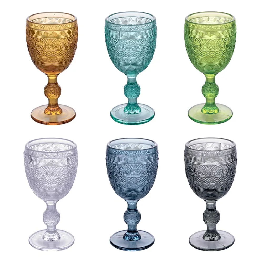 Dieses Set aus 12 Gläsern ist ein Triumph der Farbe und der klassischen Ornamentik . Mit Farbtönen von warmem Gold bis zu leuchtendem Grün und von transparentem Eis bis zu Mitternachtsblau spiegelt jedes Stück eine einzigartige und zeitlose Schönheit wider. Das Design mit geometrischen Motiven und raffinierten Symmetrien verleiht ein Gefühl von antiker Pracht, perfekt für einen mit Stil und Raffinesse gedeckten Tisch. Diese Gläser sind nicht einfach nur Behälter für Getränke, sondern echte Kunstobjekte , ideal zum Feiern besonderer Anlässe oder um täglich einen Hauch von Luxus zu genießen.