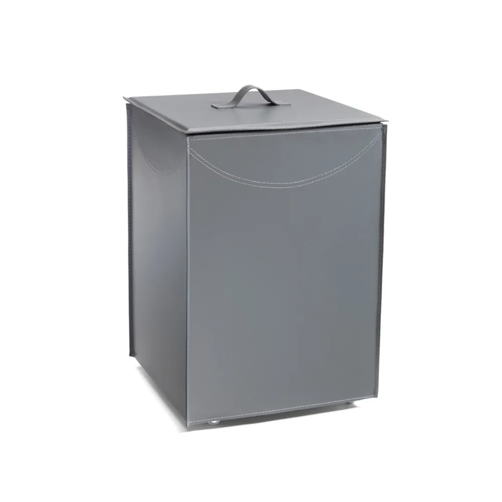Holzbehälter mit Sperrholzstruktur , vollständig mit grauem Leder bezogen, mit Kontrastnähten und gummierten Rädern, vollständig in Italien hergestellt.