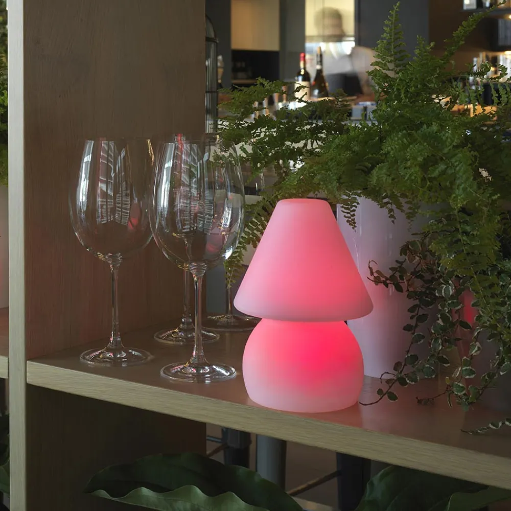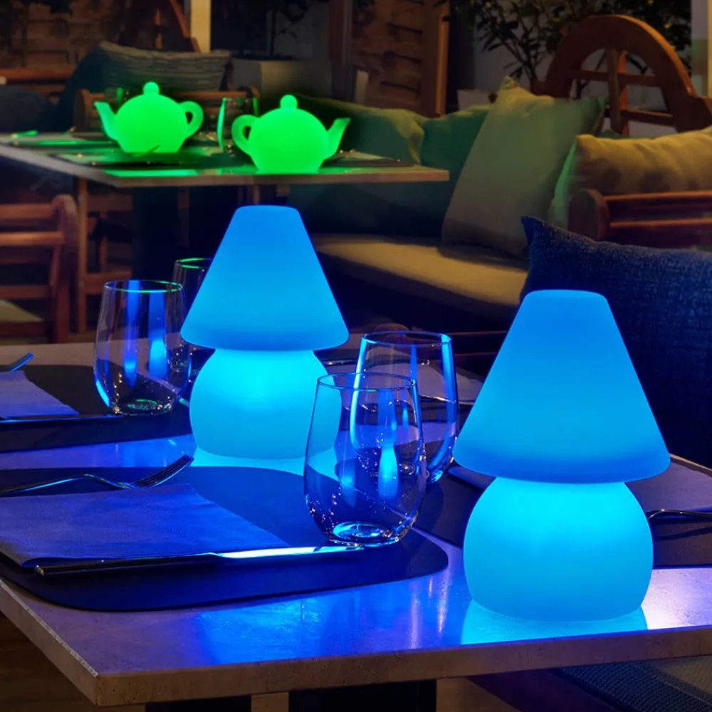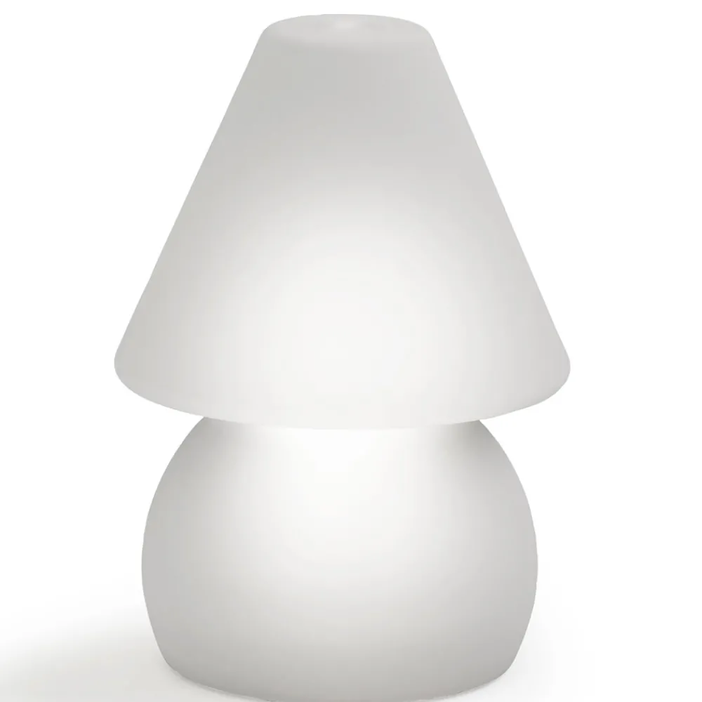 In Italien hergestellte Außenlampe aus perlmuttfarbenem Polyethylen mit integrierter RGB-LED , ausgestattet mit wiederaufladbaren Batterien und Fernbedienung, perfekt für die Beleuchtung von Abenden im Freien und zur Schaffung einer romantischen Atmosphäre, wenn sie in einem Innenbereich aufgestellt wird. Diese Tischlampe wurde für diejenigen entworfen, die den Wunsch haben, die Außenbereiche ihres Hauses mit einem innovativen Touch zu verschönern, und verwandelt Ihre Abende mit einem Hauch von Magie in echte Entspannungserlebnisse.