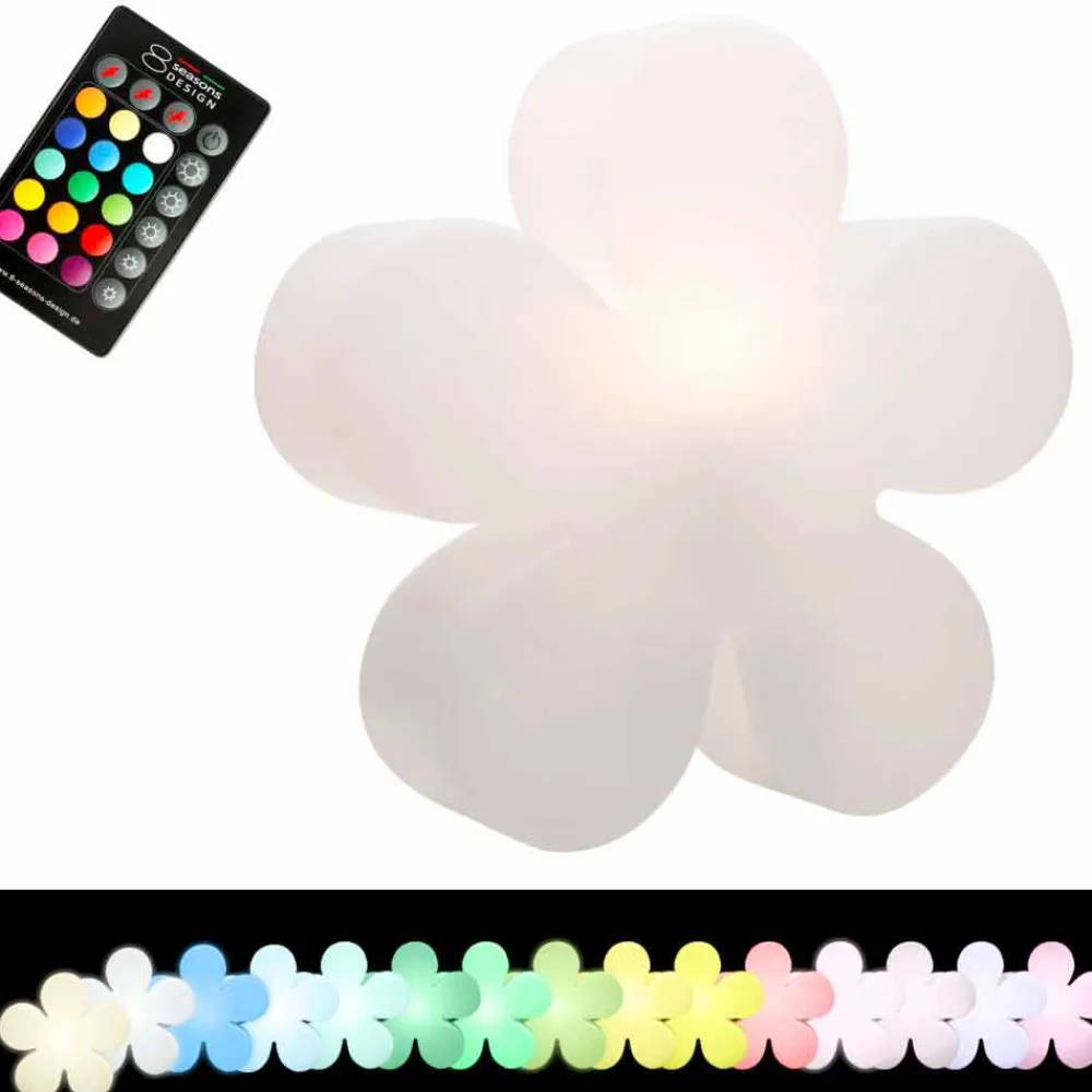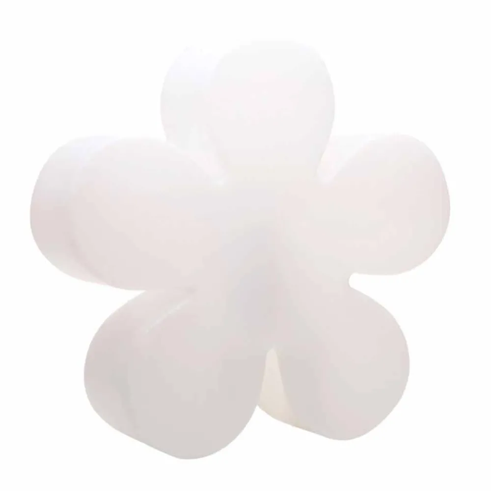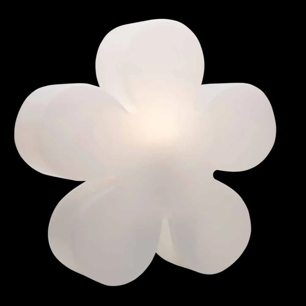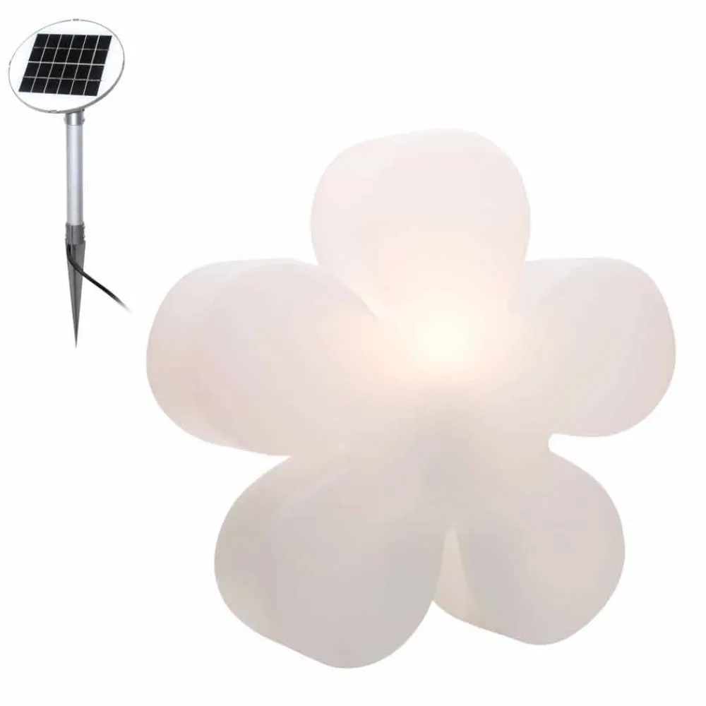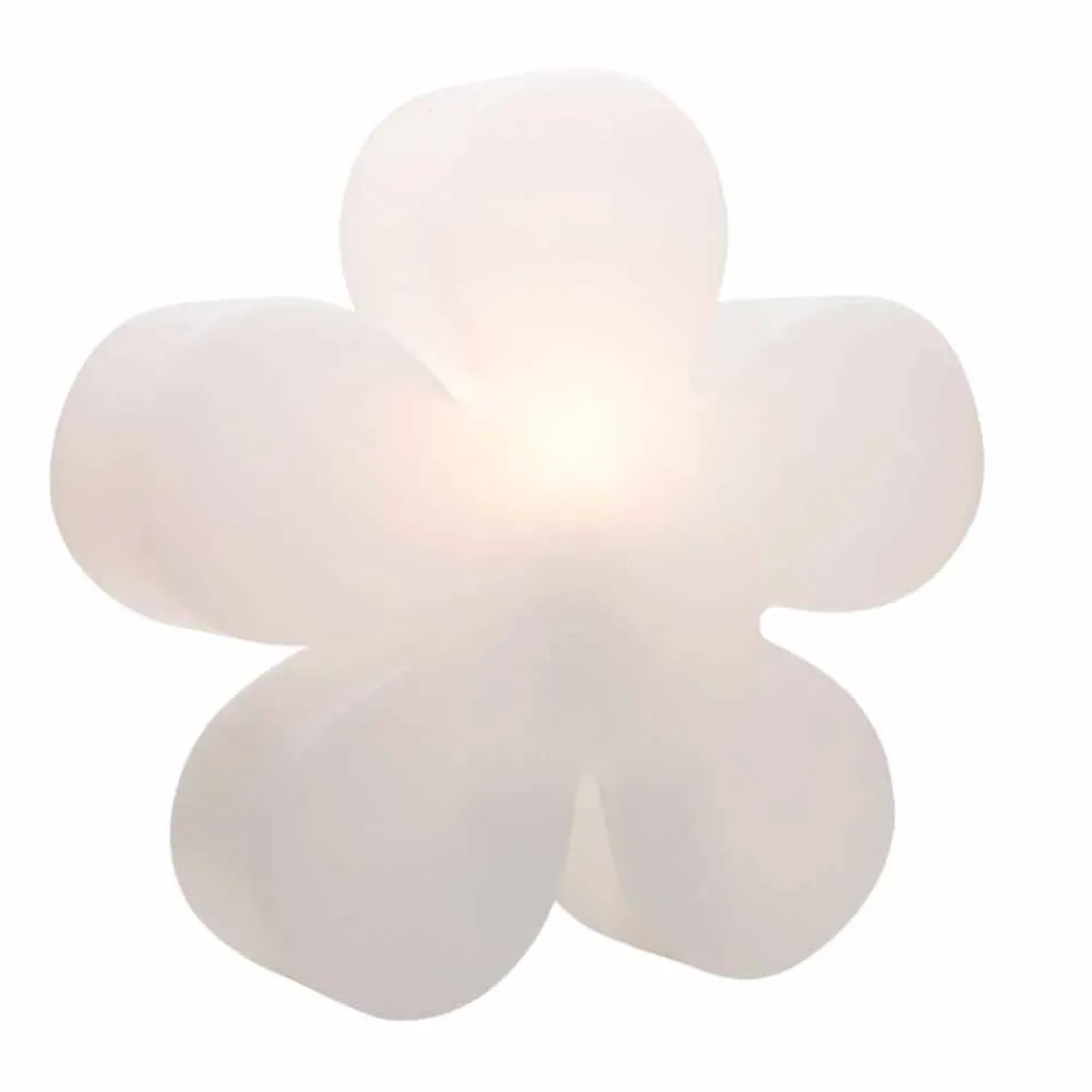Blumenförmige Stehlampe aus weißem Polyethylen, wahlweise mit Aufsatz und in zwei Größen für drinnen oder draußen.