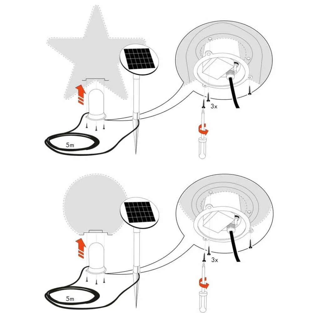 - Solaraufsatz für den Außenbereich : Enthält ein fest installiertes monochromatisches weißes LED- Beleuchtungssystem mit einem externen Solarmodul mit integrierter Batterie (1800 mA), das das Sonnenlicht tagsüber einfängt und dann in Strom umwandelt. Für das korrekte Laden der Lampe, die sich in der Dämmerung über einen Lichtsensor selbständig einschaltet, ist eine ausreichende und ausreichende Menge an Solarlicht erforderlich. Dieses System benötigt keine Steckdosen, um die Umwelt zu schützen. Ideal für Beleuchtungswege, Balkone und Terrassen. Dauer bei voller Ladung: ca. 6 Stunden. Leistungsaufnahme: 2 Watt, Temperatur: warmweiß 3000K, schwarzes Kabel 5m.