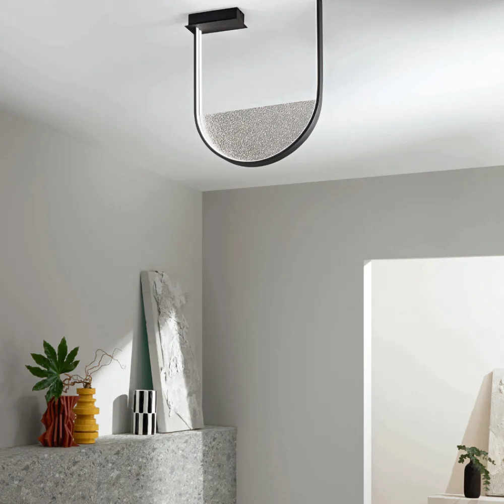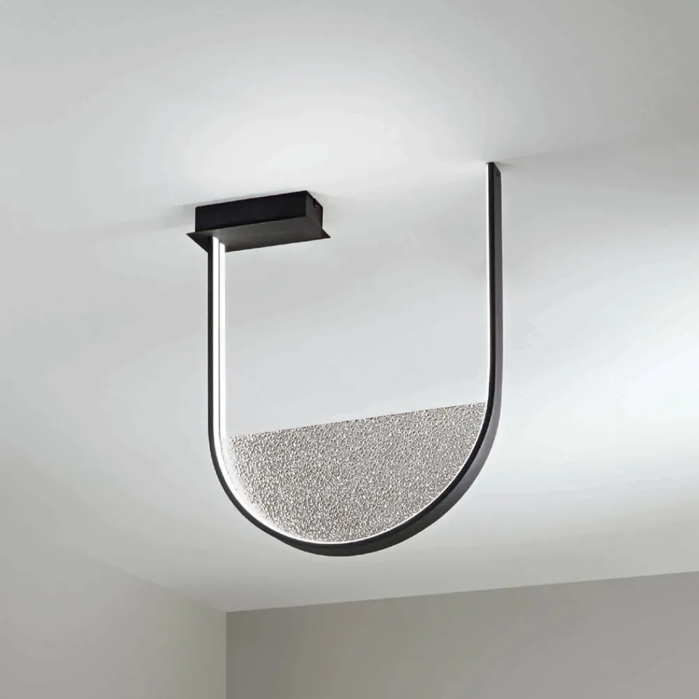 Komplett in Italien hergestellte Deckenleuchte aus schwarz lackiertem Metall mit abnehmbarem Einsatz aus Rauchglas und dimmbarem LED-Licht.