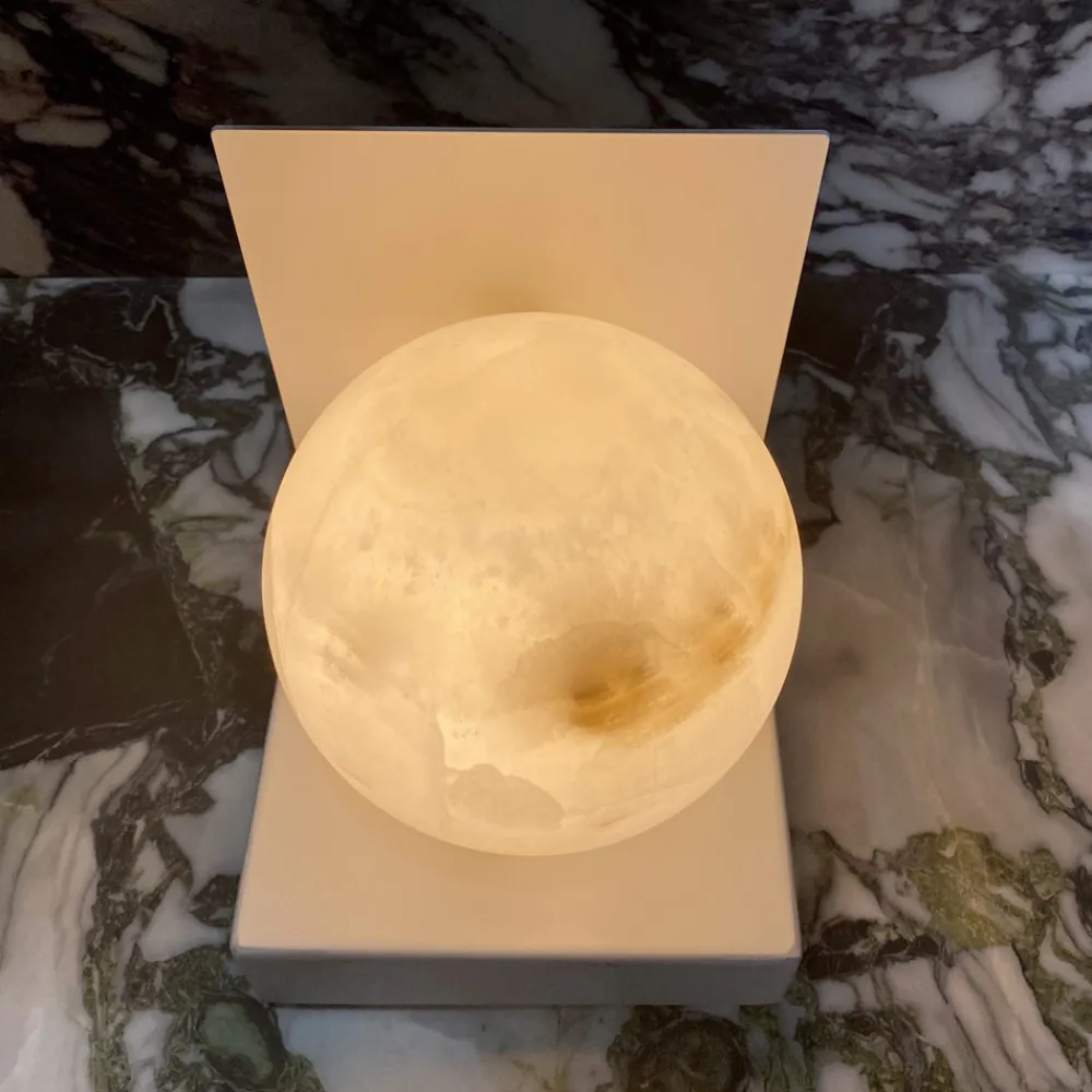 Diese Kugellampe aus Marmor ist ein Statement von Stil und Wärme, perfekt für alle, die jeder Umgebung eine intime und einladende Atmosphäre verleihen möchten. Die Kugelform aus durchscheinendem Marmor strahlt ein weiches und diffuses Licht aus und projiziert die zarten Muster seiner natürlichen Adern an die Wände.