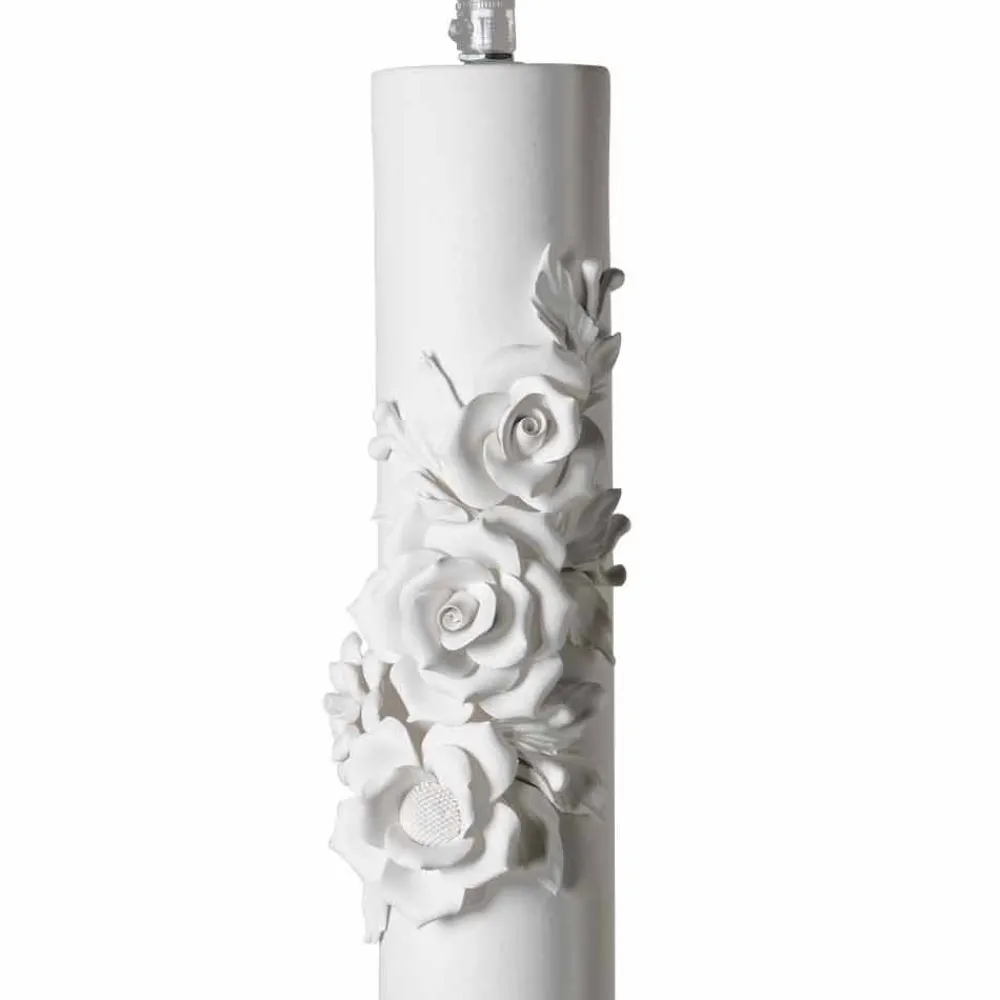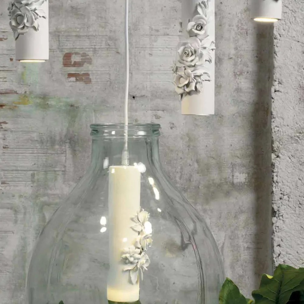 Handgefertigte Hängelampe aus mattweißer Keramik mit dekorativen Blumen, hergestellt in Italien.