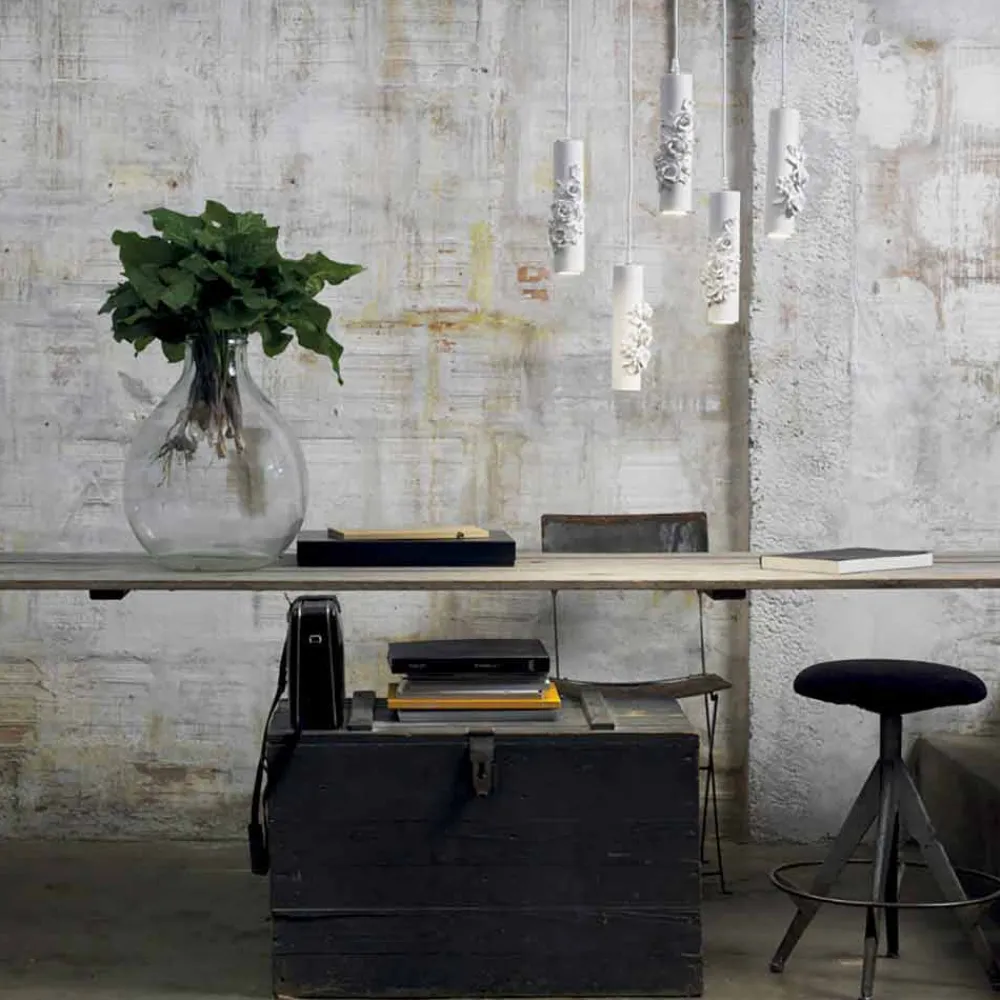 Der einfache Keramikzylinder ist in einen Blumenwind gewickelt, der durch die Reinheit der Stillinien und des Materials hervorgehoben wird. Es gibt keine Exzesse, das perfekt ausbalancierte Design kann somit in verschiedene Kontexte eingefügt werden, von den modernsten für einen Hauch von purer Eleganz bis zu den klassischsten und industriellsten, für eine zeitgemäße Atmosphäre und einen Kontrast, der begeistert.