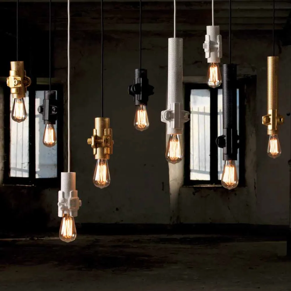 Diese originelle und einzigartige Hängelampe besteht aus einer Röhre und einer Verbindung, zwei Elementen, die sich in Lichtvektoren verwandeln können, um ein Design zwischen dem Technischen und dem Anspruchsvollen des Industriestils zu schaffen.