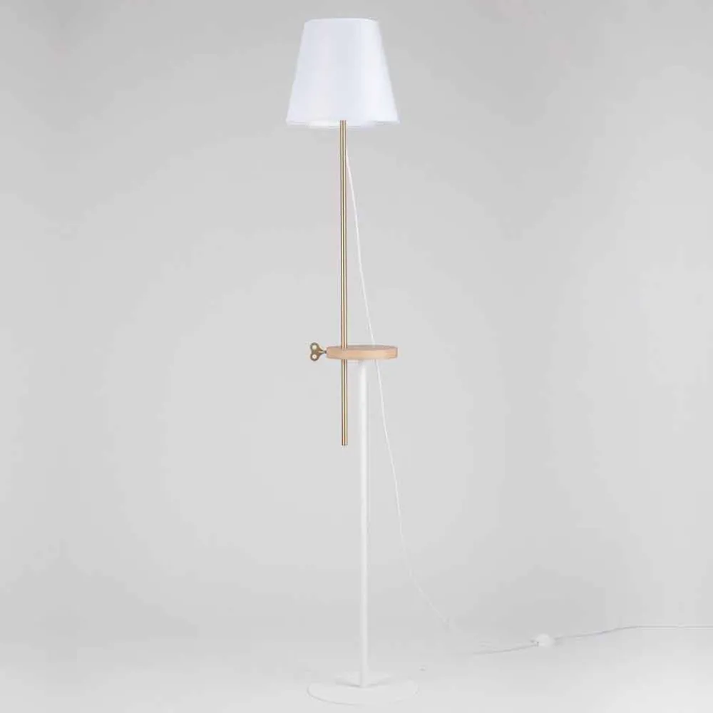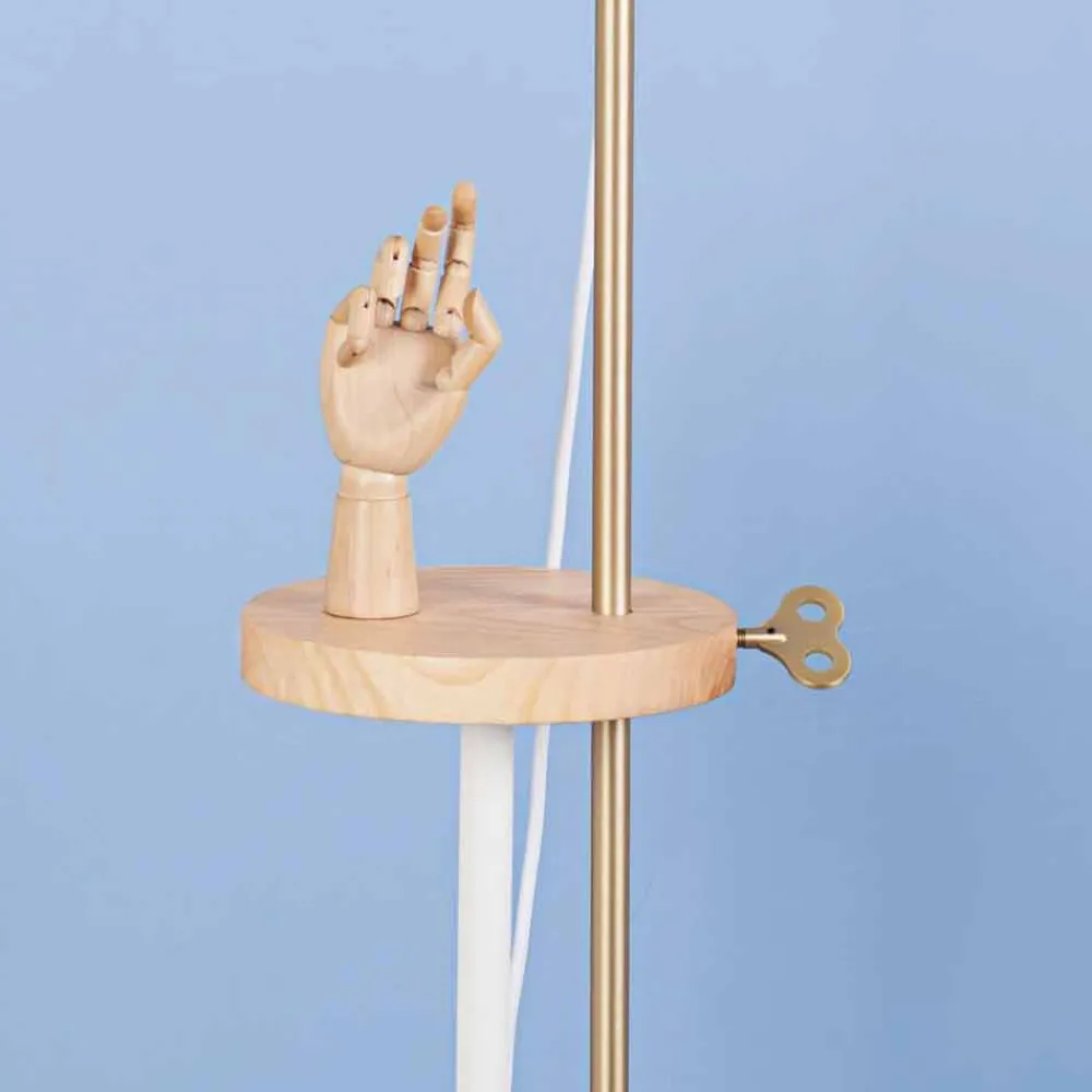 Diese Stehlampe wird vollständig in Italien hergestellt und stellt die perfekte Verschmelzung von Design und Funktionalität dar, ohne den dekorativen und visuellen Aspekt zu vernachlässigen. Der Sockel und der Lampenschirm bestehen aus RAL-lackiertem Stahl, während der mittlere Teil der Lampe über ein Regal aus Eschenholz verfügt, das als Auflagefläche, aber vor allem auch als grundlegendes technisches Element dient, um den Leuchtteil in verschiedene Höhen zu bringen. Mit dem schlüsselförmigen Einsatz aus Messing können Sie die Lampe in der von Ihnen bevorzugten Höhe befestigen und so die gesamte Umgebung oder einen kleineren Raum beleuchten. So können Sie beispielsweise bequem ein Buch auf dem Sofa lesen.