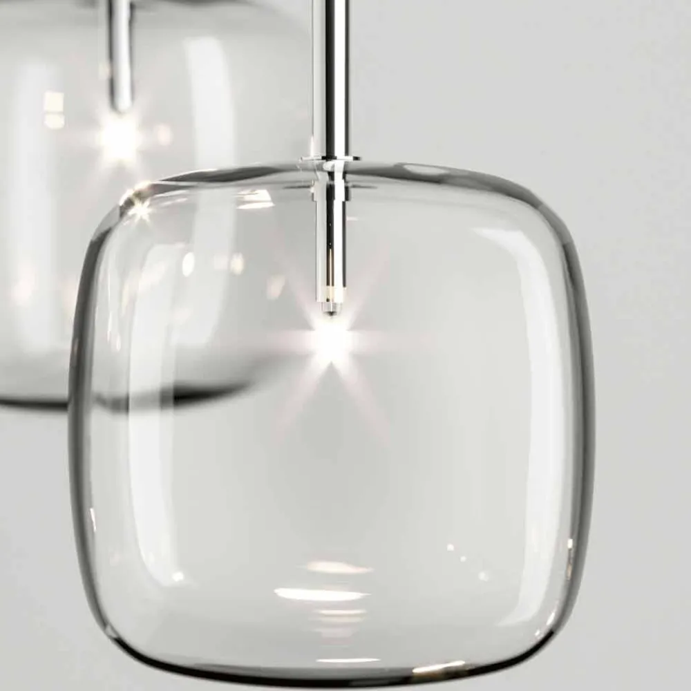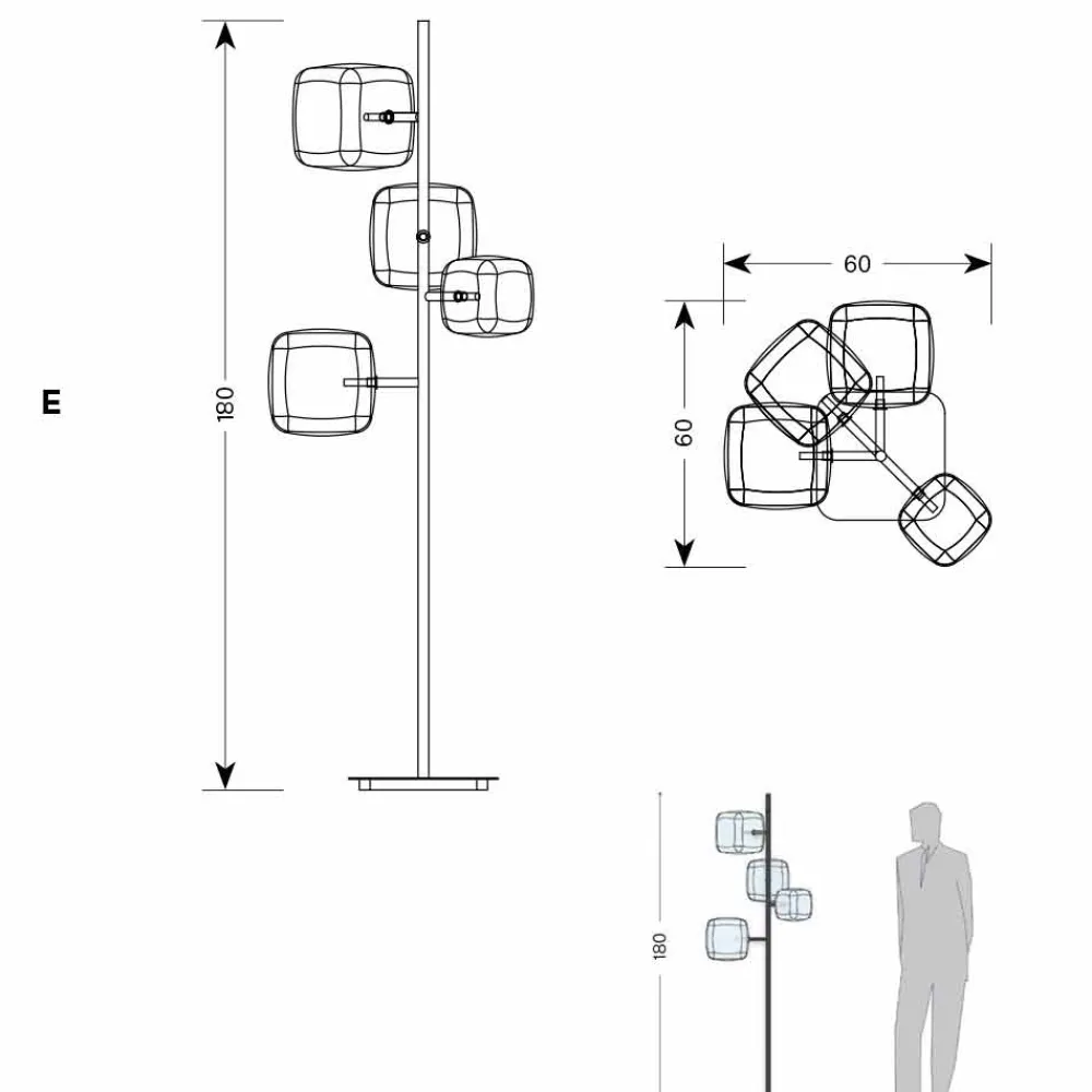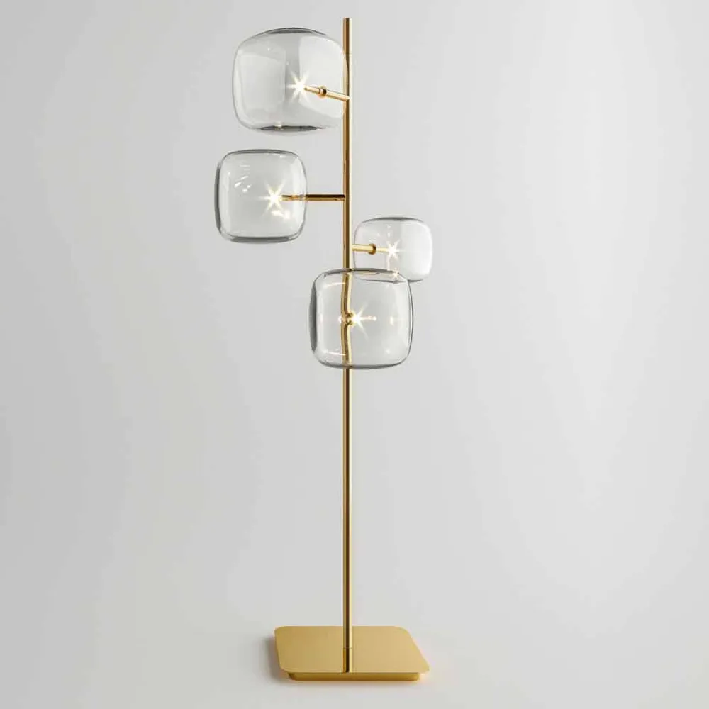 Die Stehlampe ist ein grundlegendes Element in jedem Haus, da sie zwei Funktionen erfüllt: einen Lichtpunkt zu erzeugen und gleichzeitig die Umgebung zu dekorieren. Diese Stehlampe wird in Italien hergestellt und repräsentiert eine äußerst elegante und wirkungsvolle Beleuchtungsidee, die dazu beiträgt, eine Umgebung mit einer raffinierten und modernen Atmosphäre zu schaffen. Die glänzende Metallstruktur umfasst würfelförmige Dekorationen mit abgerundeten Ecken aus transparentem geblasenem Pyrexglas mit G4 3000K LED-Licht und dimmbarer Glühbirne.