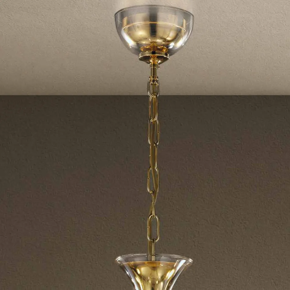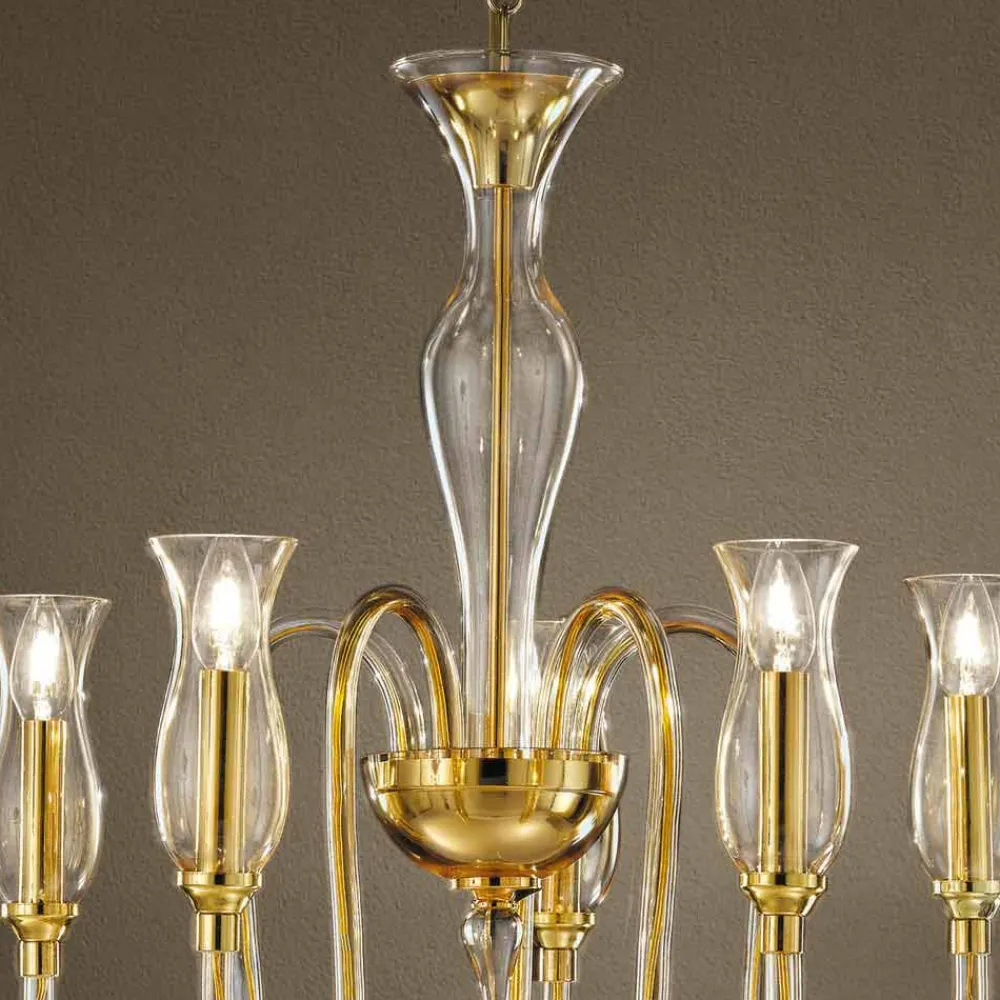 Feiner und eleganter 5-flammiger Kronleuchter, handgefertigt in Italien aus mundgeblasenem venezianischem Glas mit Bernstein- und Kristallfinish mit Details aus glänzendem goldenem Metall . Ein innovatives Design , das die edlen Formen von Glas unter einer neuen Perspektive aufgreift, um eine Form von revolutionärer Schönheit zum Leben zu erwecken, die sich an moderne oder klassische Räume anpassen kann. Die geschwungenen und dynamischen Linien , die seine Struktur beschreiben, definieren traditionelle Formen neu, um eine elegante und moderne Beleuchtungsidee zu bieten, die in der Lage ist, eine einladende und stilvolle Atmosphäre zu schaffen .
