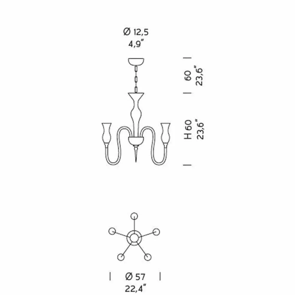 5-flammiger Kronleuchter handgefertigt in Italien aus venezianischem Glas und Metall.