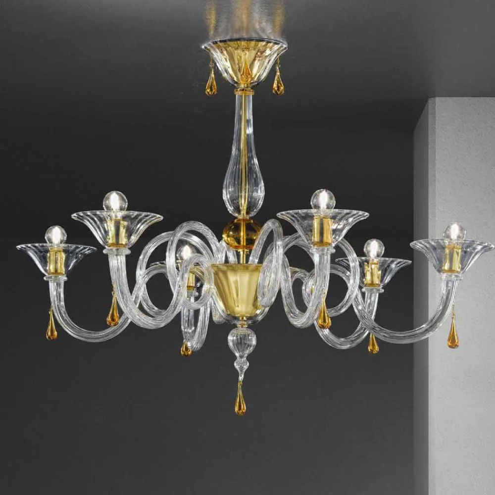 Eleganter und raffinierter Kronleuchter mit klassischem Design, handgefertigt in Italien aus farbigem Glas von Venedig mit Kristall- und Bernstein-Finish mit Details aus glänzendem goldenem Metall . Traditionelle Linien , die sich zu einem vielseitigen Stil entwickeln , der auch für große Räume mit moderner Einrichtung geeignet ist , um mit Kontrasten für eine einzigartige und exklusive Beleuchtung zu spielen . Seine strenge Eleganz ist geprägt von Ausgewogenheit und Symmetrie , Elemente, die der Ästhetik des Kronleuchters seine imposante Persönlichkeit und seinen hohen Wert verleihen. Das Design wird durch die beispiellose Form der Arme bereichert, die bei der Verarbeitung des mundgeblasenen Glases für ein kreatives und faszinierendes Ergebnis modelliert wurden.