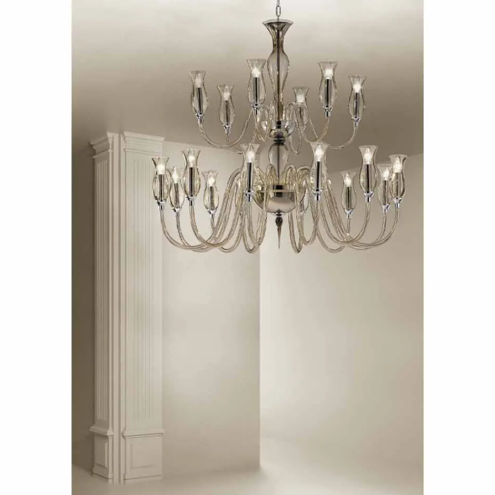 Feiner und filigraner 18-flammiger Kronleuchter aus Venedig-Glas in Rauchoptik mit polierten verchromten Metalldetails , Made in Italy . Aus der Neuinterpretation der klassischen und edlen Glasformen entsteht eine neue Schönheitsformel , die sich durch geschwungene und essentielle Linien auszeichnet, die traditionelle Formen neu definieren und einer Einrichtungslösung Leben einhauchen, die jede Umgebung mit Persönlichkeit vervollständigen kann. Was die Ästhetik bereichert , ist die glatte Oberfläche des Glases , die das Licht in verschiedene Richtungen gleiten lässt für Transparenzspiele , die sich mit den lebendigen Lichteffekten für ein exklusives Ergebnis mit starker visueller Wirkung verbinden .