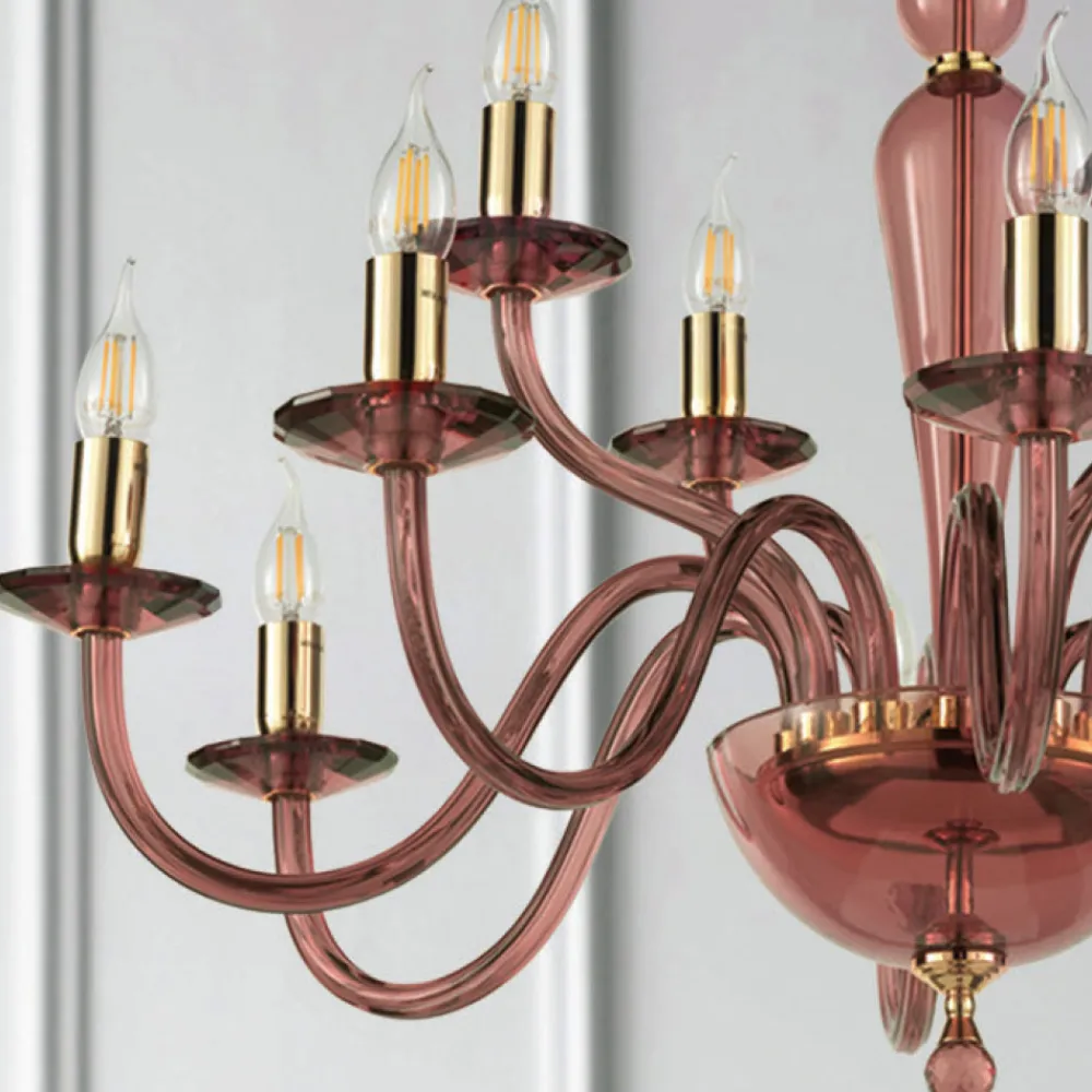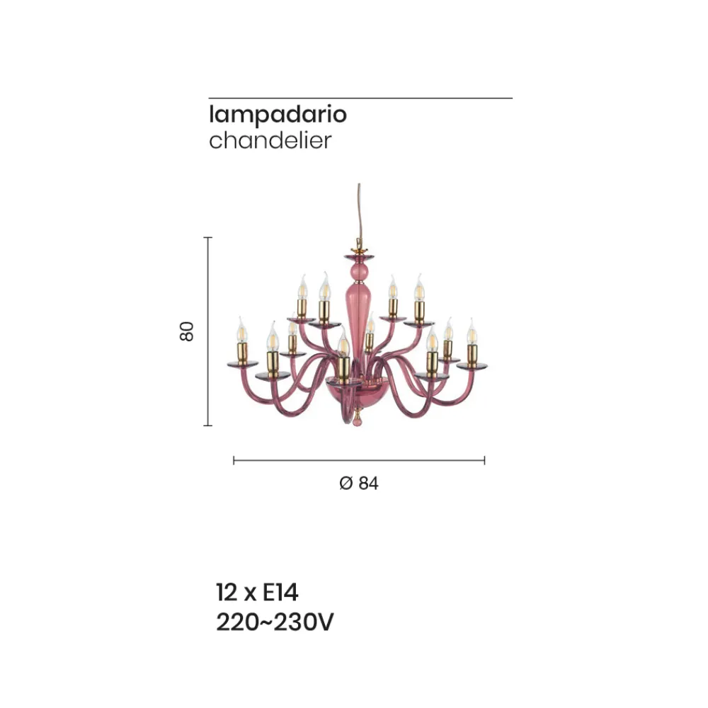 Dieser Hängeleuchter im klassischen Stil besteht aus 12 gewölbten Armen aus in Italien handgefertigtem Glas in burgunderroter Ausführung die die Untertassen tragen, auf denen sich die Lichtquellen befinden.