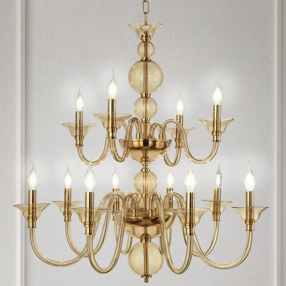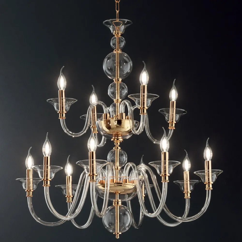 Ideal für alle, die eine szenografische Beleuchtung im Stil vergangener Zeiten wünschen. Ihr klassisches und luxuriöses Design besteht aus übereinander angeordneten Kugeln für den Leuchtenkörper, die einen Blick auf den goldenen Metallkern ermöglichen, und aus 12 gewölbten Armen , komplett aus handgefertigtem Glas gefertigt und in verschiedenen eleganten Farbtönen erhältlich, um sich perfekt an jeden Ort anzupassen und unterschiedliche Bedürfnisse zu befriedigen.