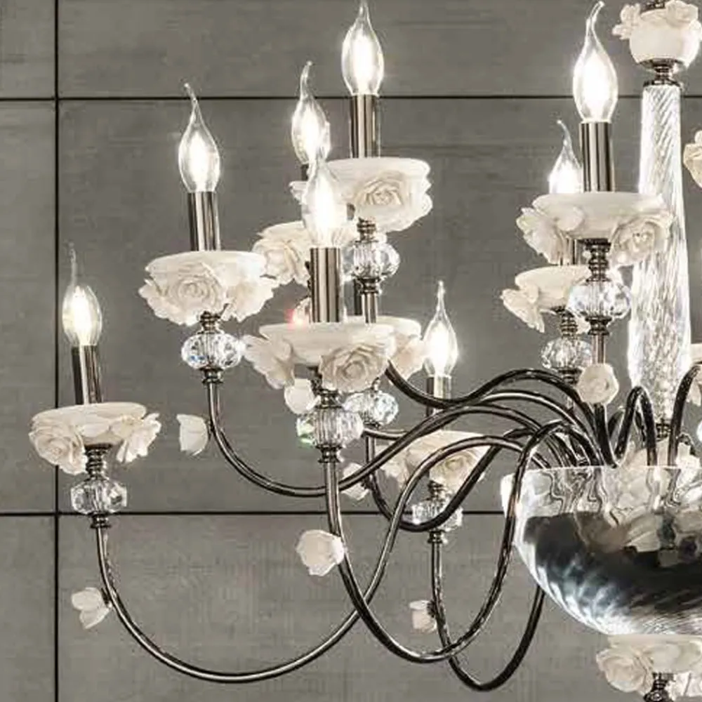 Kronleuchter mit 30 Lichtern aus Porzellan und mundgeblasenem Glas, Luxus made in Italy.