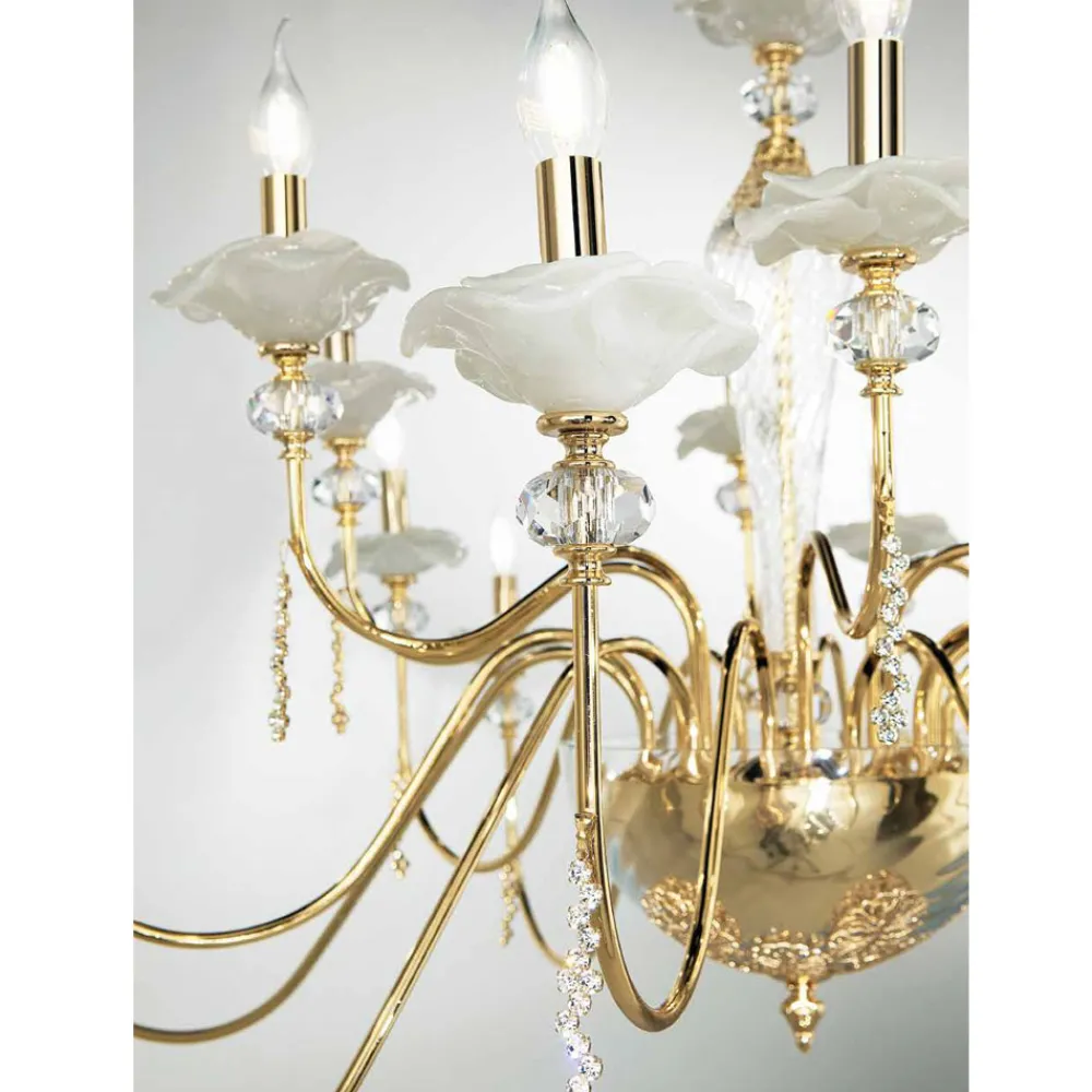 Was es einzigartig und majestätisch macht, sind die Knospen aus handgefertigtem Glas von höchster Qualität und die Juwelendetails aus Kristall , die an die ebenfalls handgefertigten Tautropfen erinnern, die einen klassischen Stil der Vergangenheit zum Leben erwecken, dessen Charme zum Protagonisten wird der Zielraum.