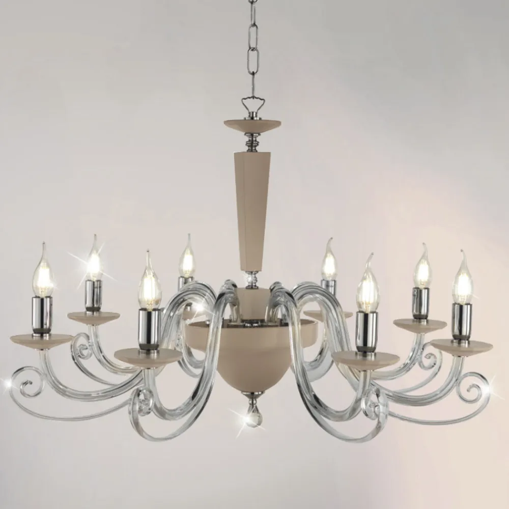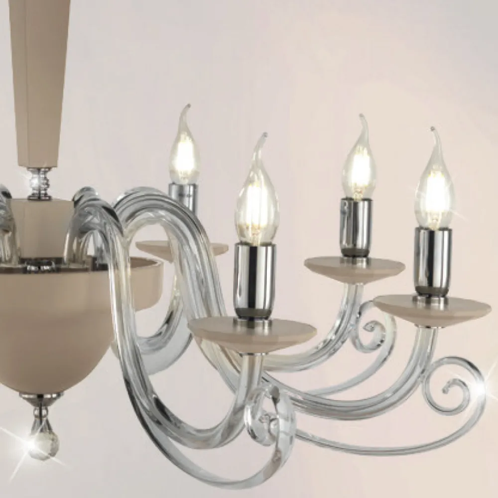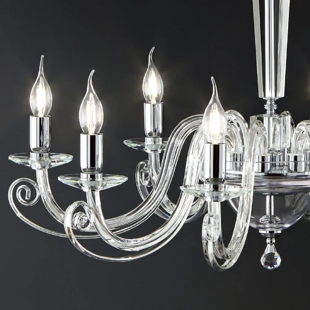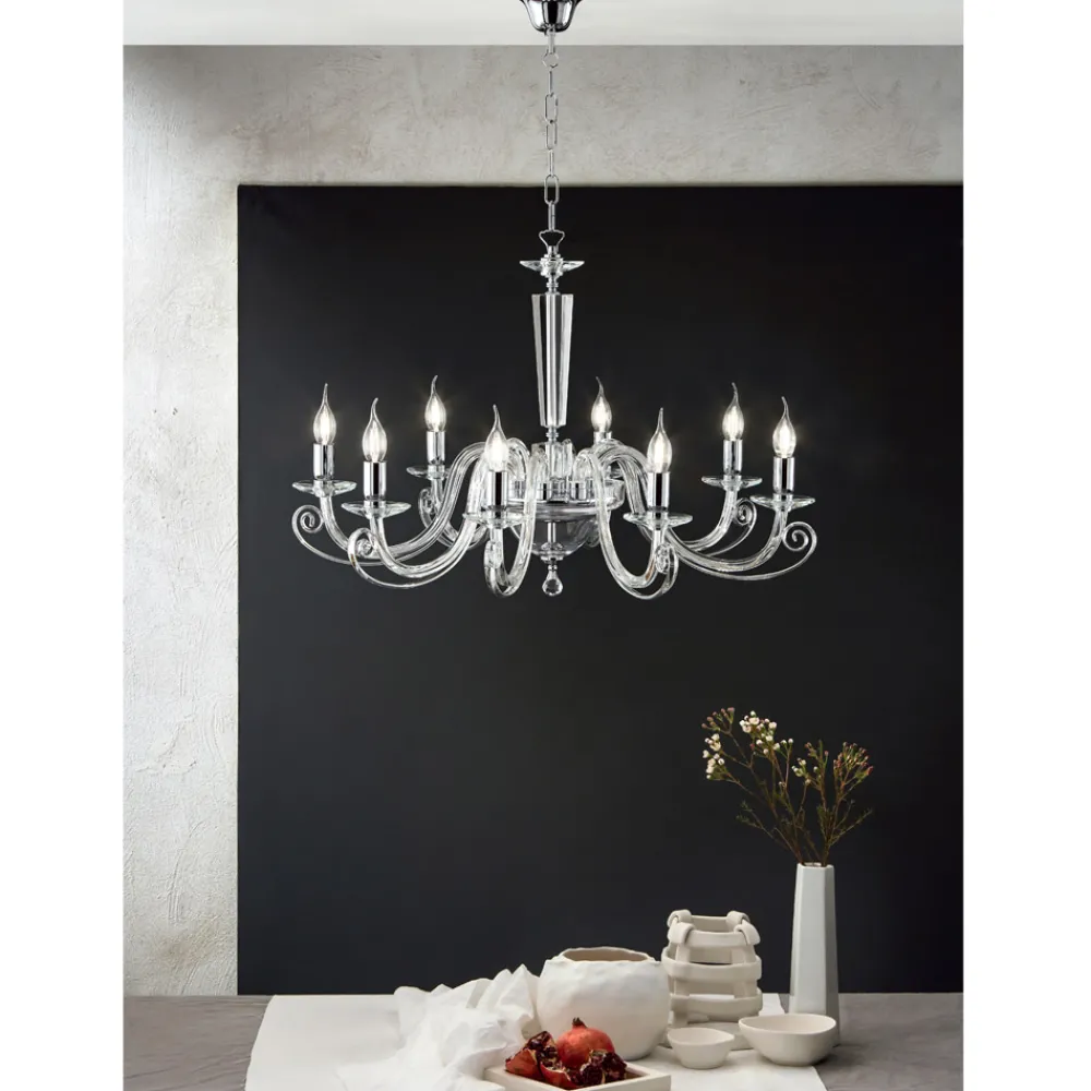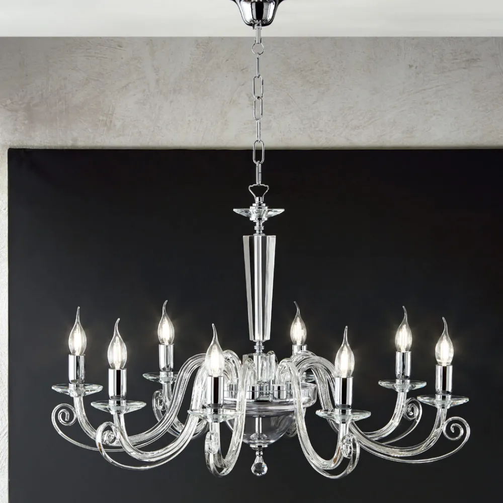 Der aus handgefertigtem Glas und optischem Kristall mit hochwertigen Materialien und besonderer Liebe zum Detail gefertigte Kronleuchter wird zum Protagonisten der Umgebung, in der er platziert wird, verziert mit dem runden optischen Kristallanhänger und den verchromten Metalldetails und Lampenfassungen .