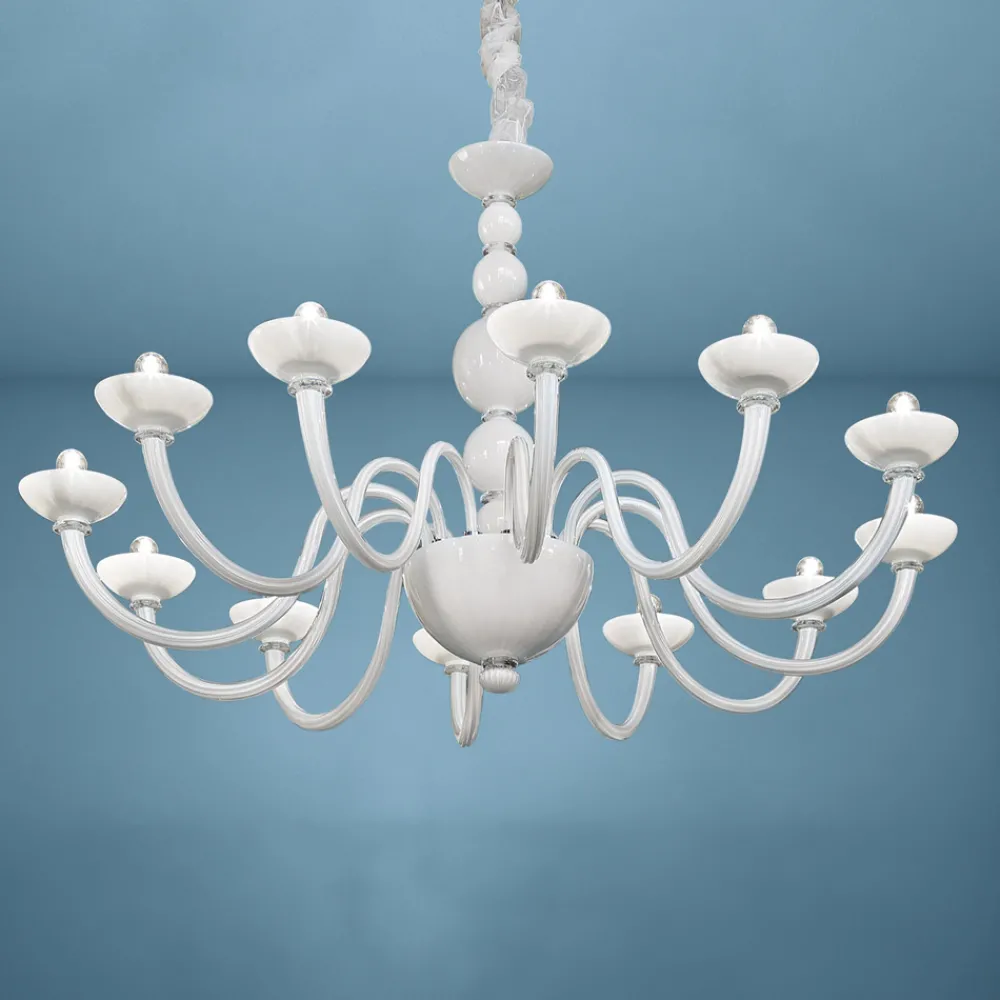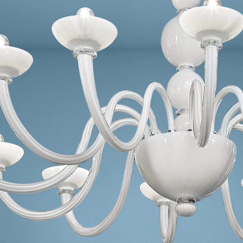 Handgefertigter Kronleuchter aus venezianischem Glas in milchweißem Kristall-Finish mit Details aus poliertem, verchromtem Metall . Ein Möbelstück mit einer erstaunlichen und ikonischen Präsenz, das sich durch eine weiche und zarte Linie und raffinierte Rundungen auszeichnet, die sich perfekt an klassische Umgebungen, aber gleichzeitig auch an Räume mit zeitgenössischem Stil anpassen. Das Element der Tradition wird durch seine wunderbaren Komponenten aus vollständig von Hand gefertigtem mundgeblasenem Glas unterstrichen, das sich dank trendiger Farben verwandelt, um sich selbst zu aktualisieren. Seine umhüllenden Formen machen es zu einem idealen Element, um jede Wohn- und Objektumgebung mit Klasse und Dynamik zu besetzen.