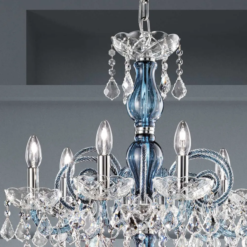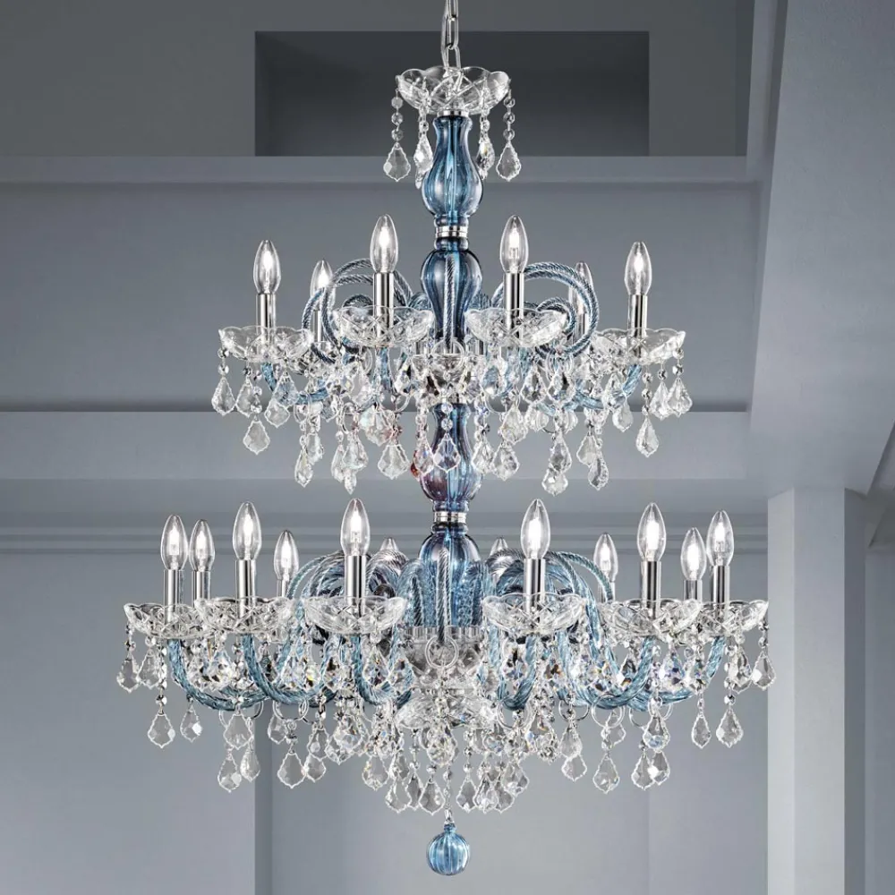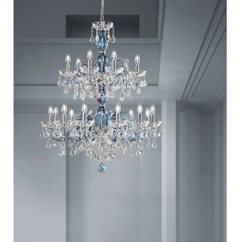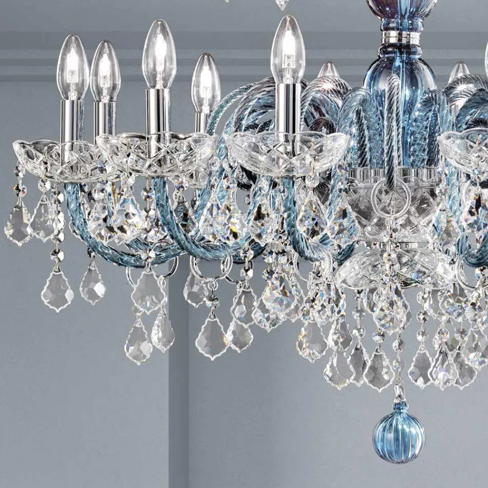 18-flammiger Kronleuchter aus venezianischem Glas in Denim-Optik mit Bleianhängern und poliertem verchromtem Metall . Diese handwerklich hergestellte Ergänzung zeichnet sich durch die wunderbaren Arme aus, die von Hand durch die Verdrehungstechnik bearbeitet wurden, wodurch ein exklusives Ergebnis entsteht, das ästhetisch an die Verflechtung eines Seils erinnert und dem Kronleuchter Persönlichkeit verleiht. Ein echter Lichtregen dringt in die Struktur des Kronleuchters ein und breitet sich dann durch Brechung durch die Magie von Pailletten und Kristallanhängern mit feinen Oberflächen in der Umgebung aus und erzeugt so einen eindrucksvollen und traumhaften szenografischen Effekt , der verzaubern und überraschen kann. für seine Eleganz und Majestät .