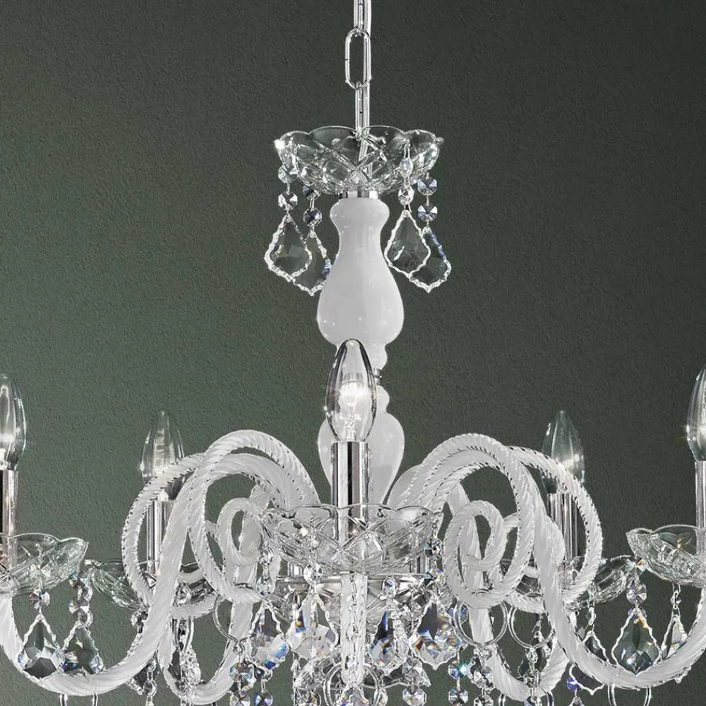 Kronleuchter aus venezianischem Glas mit milchweißem Finish mit Bleianhängern und Details aus poliertem verchromtem Metall . Diese handwerklich hergestellte Ergänzung zeichnet sich durch die wunderbaren Arme aus, die von Hand durch die Verdrehungstechnik bearbeitet wurden, wodurch ein exklusives Ergebnis entsteht, das ästhetisch an die Verflechtung eines Seils erinnert und dem Kronleuchter Persönlichkeit verleiht. Ein echter Lichtregen dringt in die Struktur des Kronleuchters ein und breitet sich dann durch Brechung durch die Magie von Pailletten und Kristallanhängern mit feinen Oberflächen in der Umgebung aus und erzeugt so einen eindrucksvollen und traumhaften szenografischen Effekt , der verzaubern und überraschen kann. für seine Eleganz und Majestät .