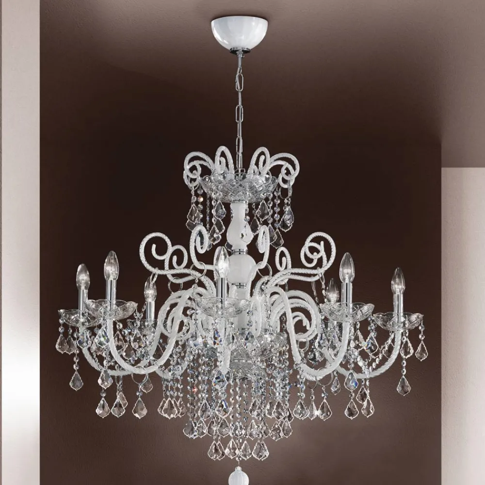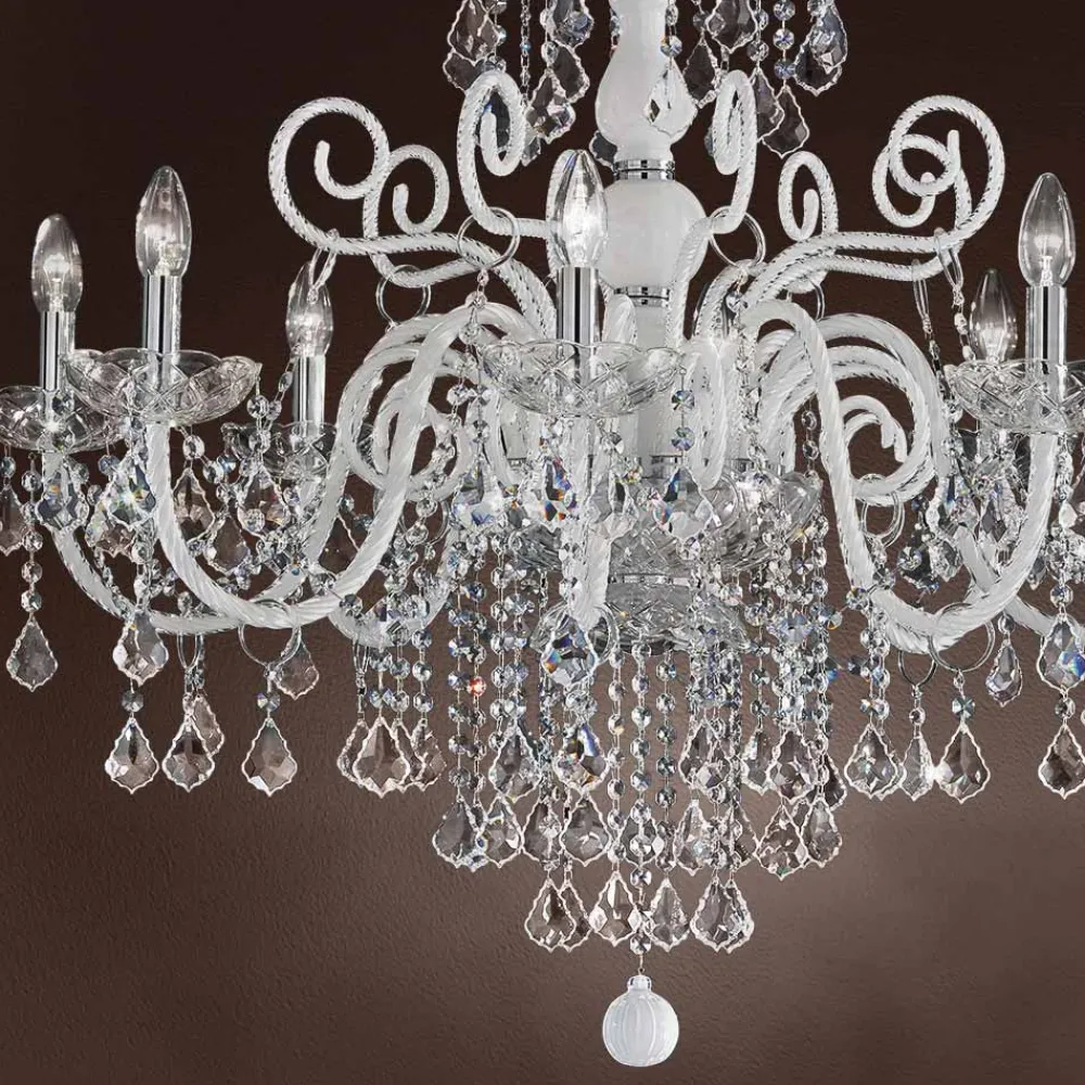 8-flammiger Kronleuchter aus venezianischem Glas mit milchweißem Finish mit Bleianhängern und poliertem verchromtem Metall . Diese handwerklich hergestellte Ergänzung zeichnet sich durch die wunderbaren Arme aus, die von Hand durch die Verdrehungstechnik bearbeitet wurden, wodurch ein exklusives Ergebnis entsteht, das ästhetisch an die Verflechtung eines Seils erinnert und dem Kronleuchter Persönlichkeit verleiht. Ein echter Lichtregen dringt in die Struktur des Kronleuchters ein und breitet sich dann durch Brechung durch die Magie von Pailletten und Kristallanhängern mit feinen Oberflächen in der Umgebung aus und erzeugt so einen eindrucksvollen und traumhaften szenografischen Effekt , der verzaubern und überraschen kann. für seine Eleganz und Majestät .