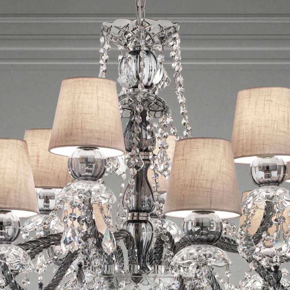 Eleganter und imposanter Kronleuchter mit 12 Lampenschirmen aus Leinen , Struktur in venezianischem Glasgrau, bereichert durch Anhänger in Kristallfinish und Details aus poliertem Chrommetall , handgefertigt in Italien . Dieser Kronleuchter zeichnet sich durch einen romantischen Charakter aus , der große Räume auf exklusive Weise ausfüllen kann, und zeichnet sich durch leuchtende Pendel und raffinierte Lampenschirme aus , die eine dynamische Einrichtungslösung mit starker szenografischer Wirkung zum Leben erwecken . Um seinen Wert zu steigern und seine ästhetische Seite zu unterstreichen, ist das Vorhandensein von Pailletten, die durch die Lichtbrechung dank beispielloser farbiger Blitze wunderbare Licht- und Schattenspiele zum Leben erwecken.
