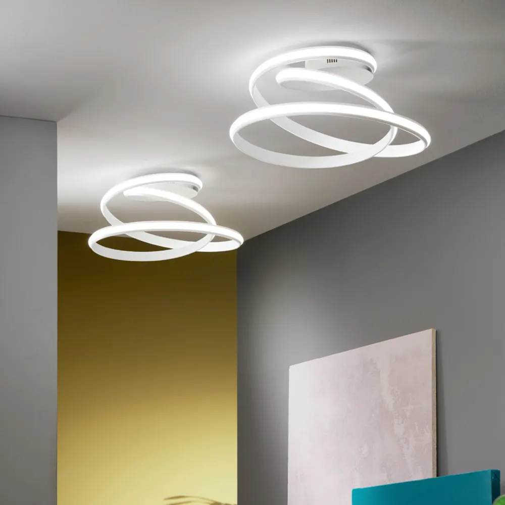 Deckenleuchte mit weiß lackierter Metallstruktur komplett mit LED-Lichtquelle . Ein dynamisches und modernes Design, das in der Lage ist, das Gefühl eines sich drehenden Bandes nachzubilden und so den Wert und die Ästhetik des Produkts zu bereichern. Dieses Bewegungsgefühl wird zu seiner Stärke und ermöglicht es ihm, in Wohn- oder Objektumgebungen mit einem zeitgenössischen und avantgardistischen Stil den Mittelpunkt der Aufmerksamkeit zu erobern. Die moderne LED-Technologie sorgt zudem für eine hochwertige Beleuchtung, die die Leuchte vervollständigt und sie zu einer optimalen Ergänzung für alle macht, die Funktionalität und Design in einem einzigen Produkt suchen.