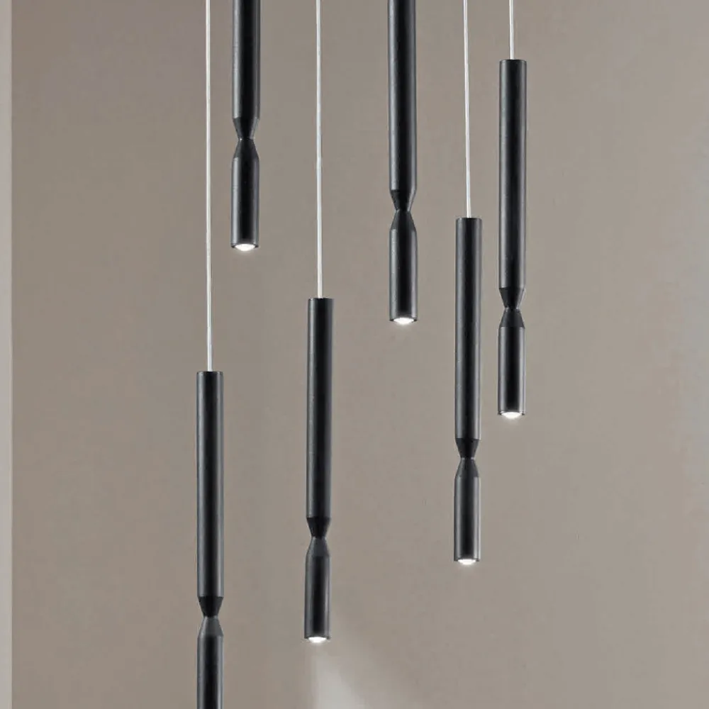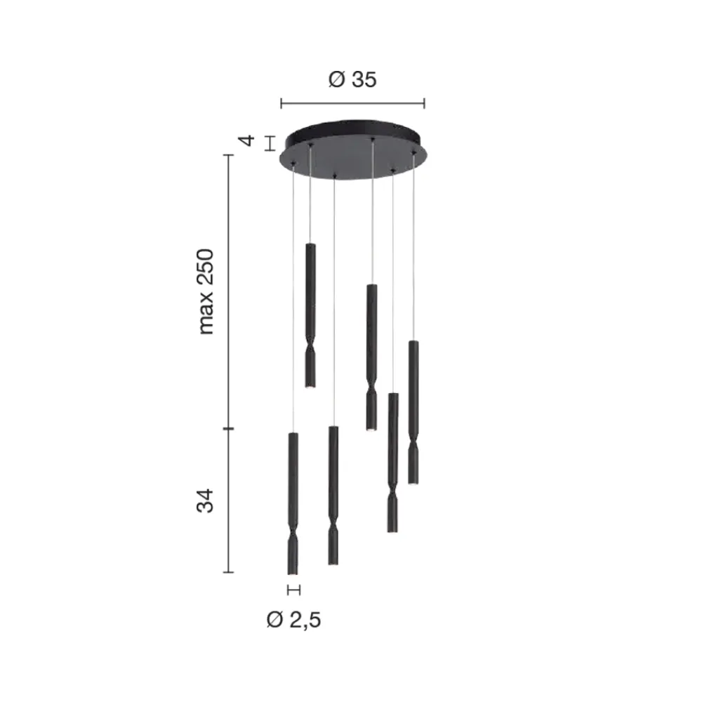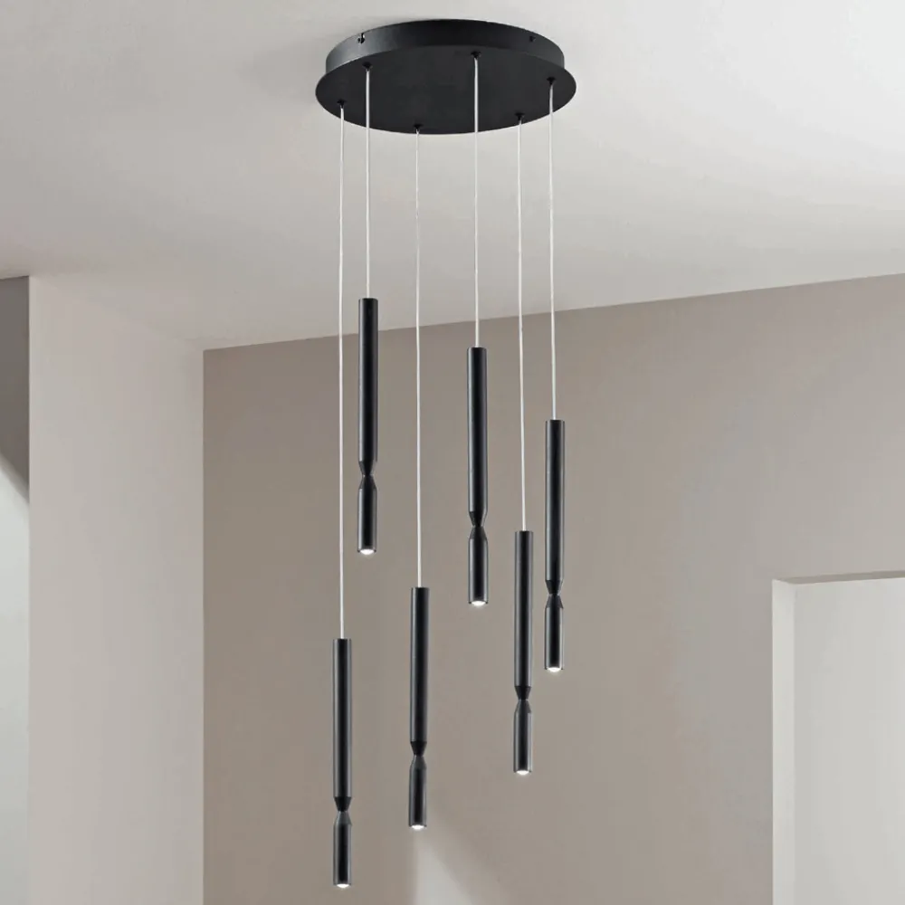 Komplett in Italien hergestellter Kronleuchter aus schwarz lackiertem Metall und 6 dimmbaren LED-Leuchten mit längenverstellbaren Kabeln .